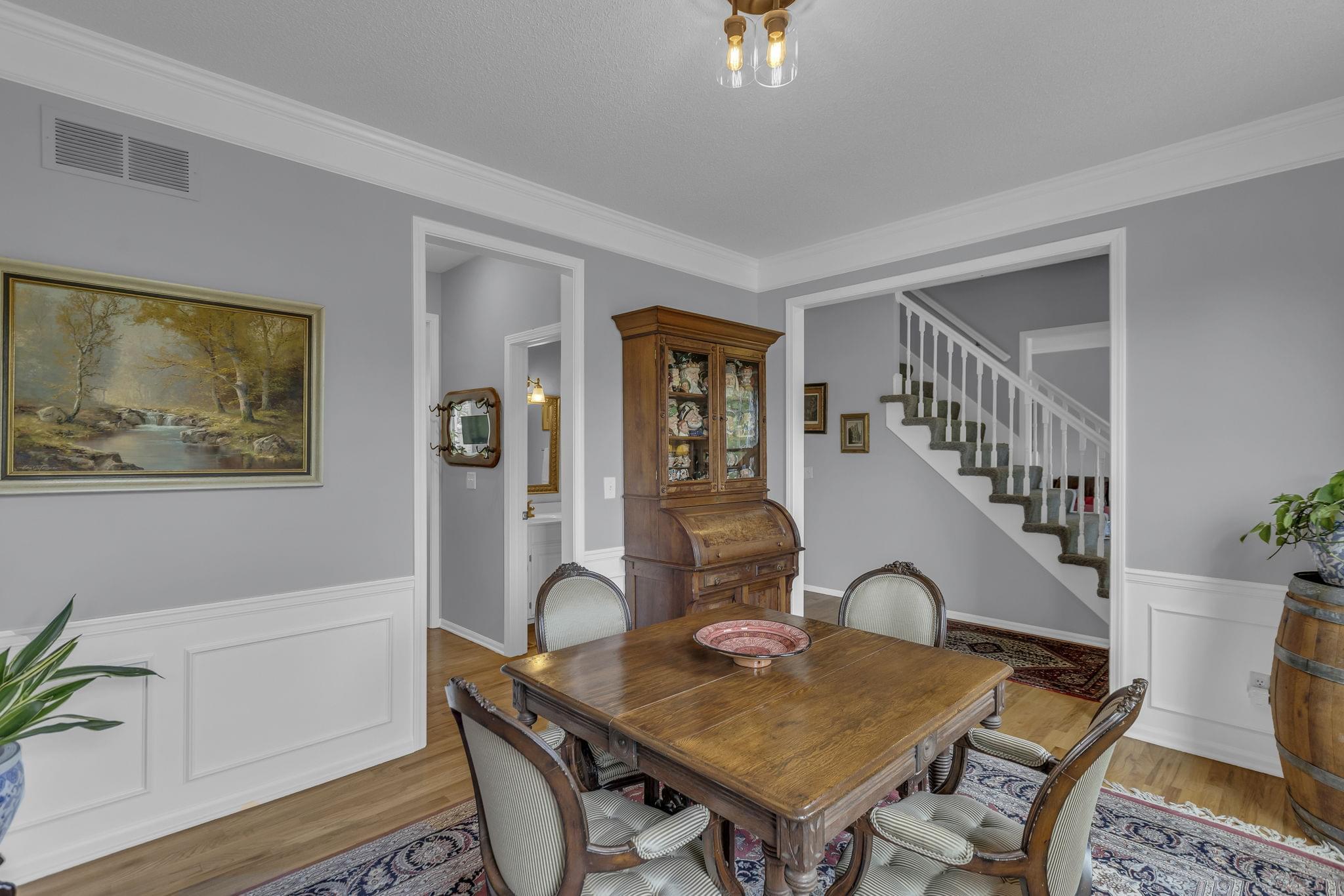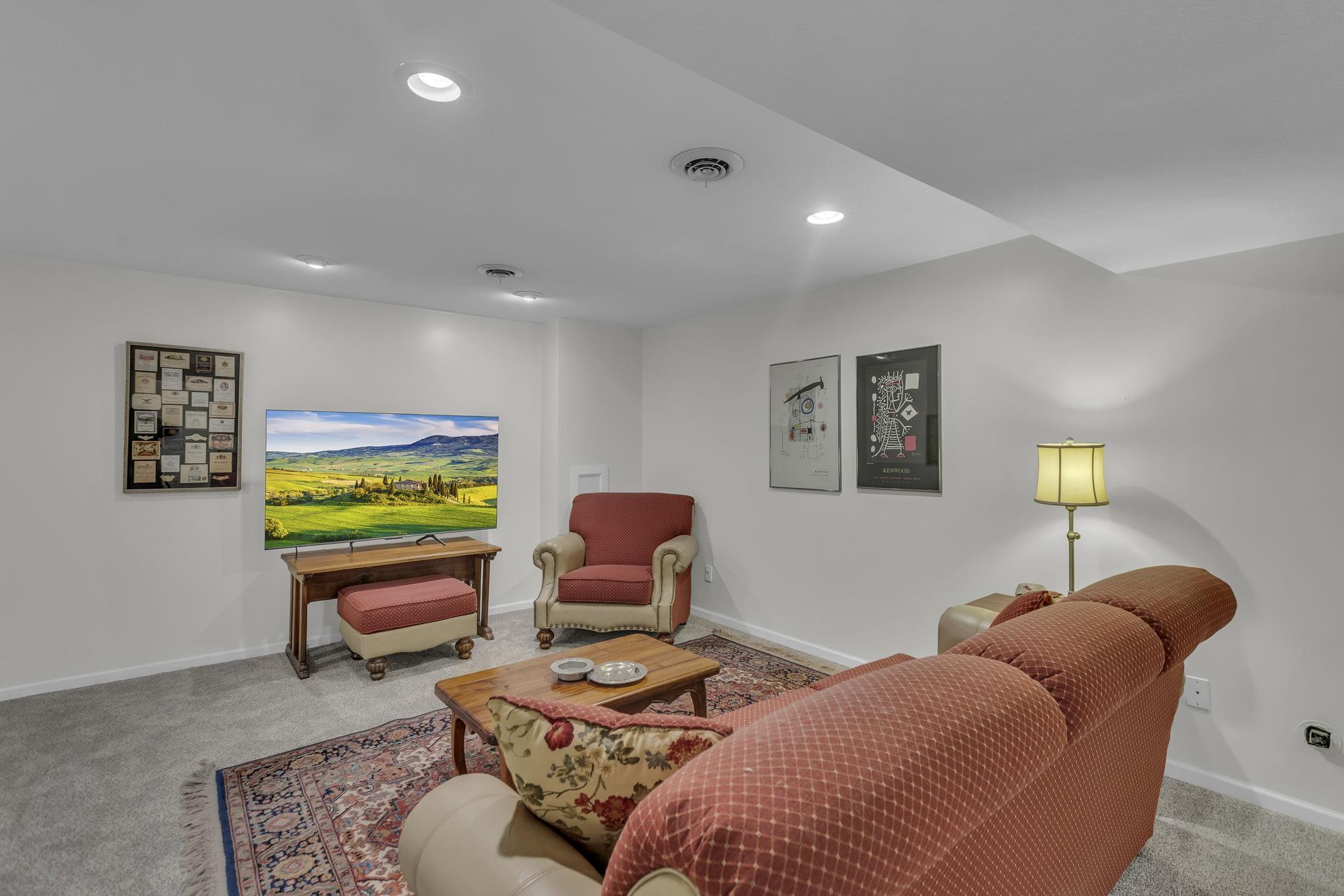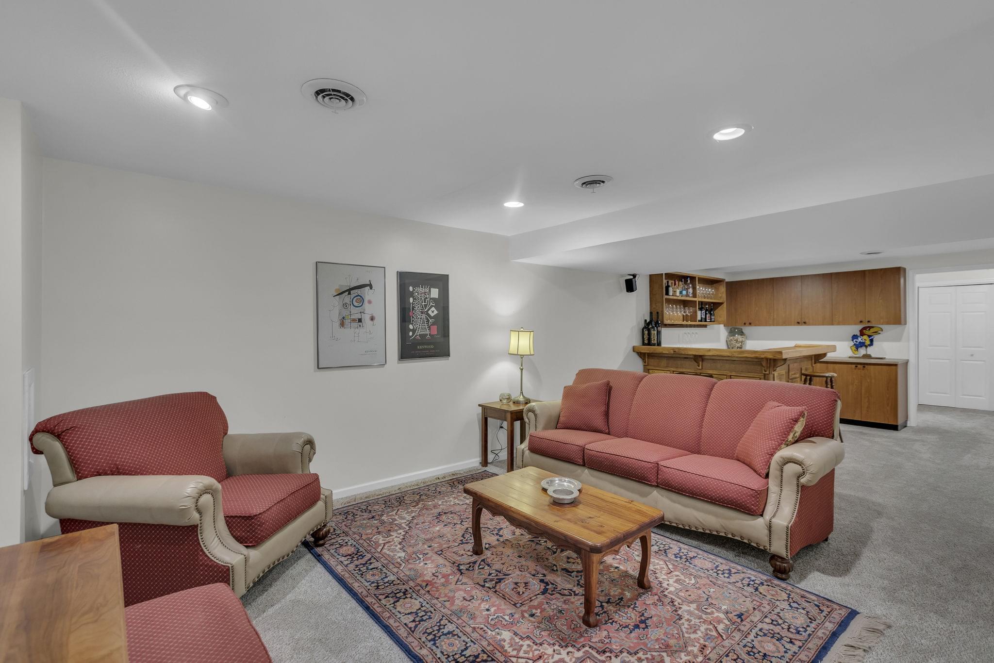 The formal dining room, accented with wainscoting, and a separate front sitting room offer options for both casual and elevated gatherings. Downstairs, the finished lower level delivers serious weekend potential—wired for surround sound with mounted rear-channel speakers, a handcrafted bar, built-in cabinetry, full bath, bonus room, generous storage and new carpet.