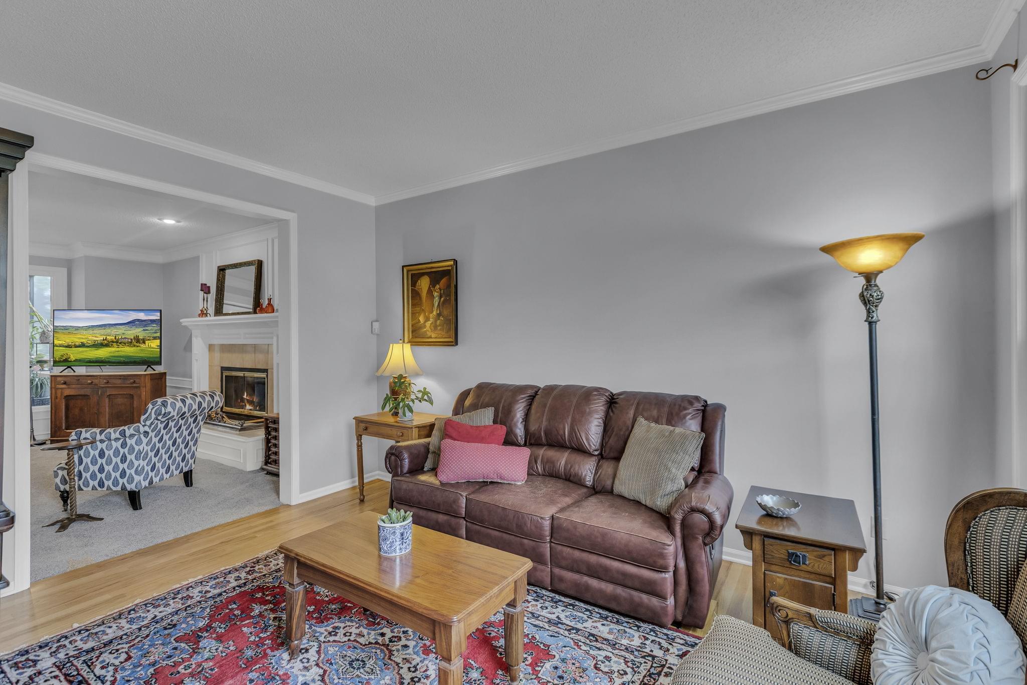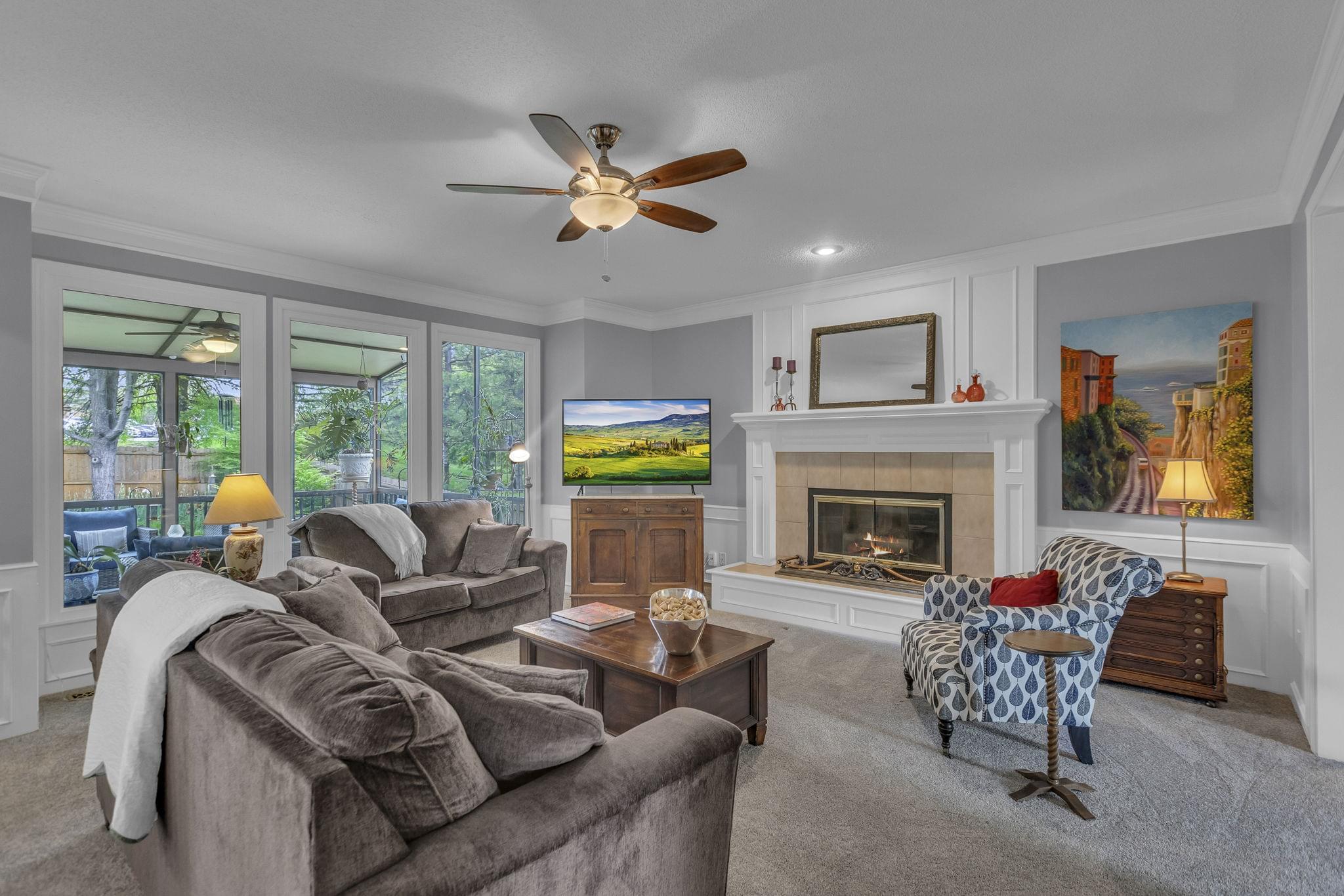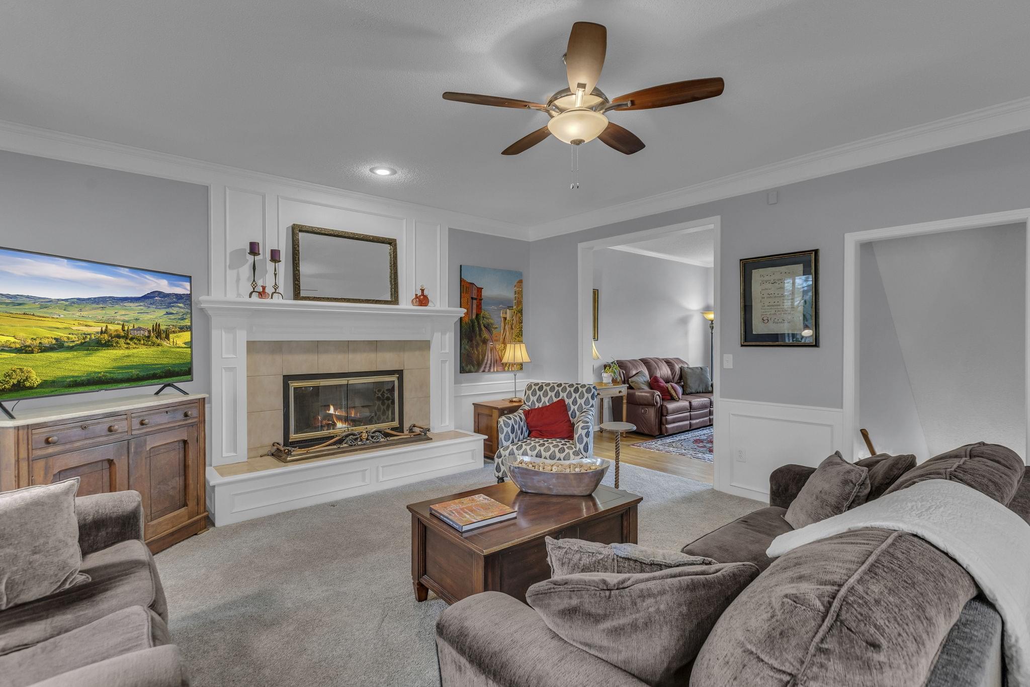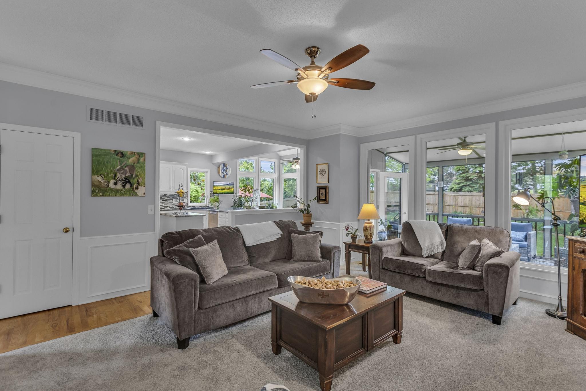 The formal dining room, accented with wainscoting, and a separate front sitting room offer options for both casual and elevated gatherings. Downstairs, the finished lower level delivers serious weekend potential—wired for surround sound with mounted rear-channel speakers, a handcrafted bar, built-in cabinetry, full bath, bonus room, generous storage and new carpet.
