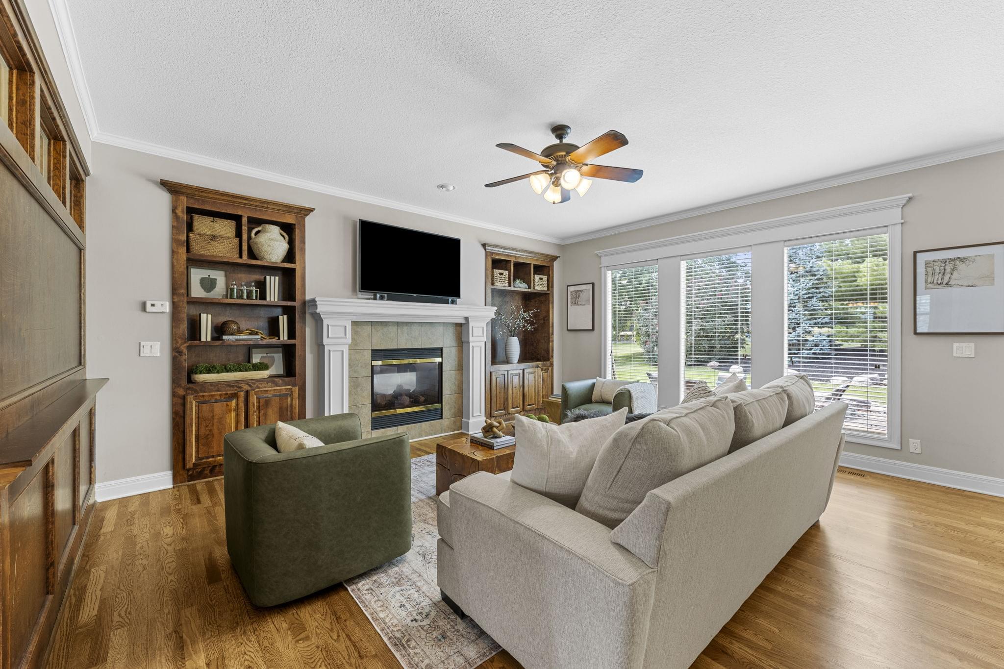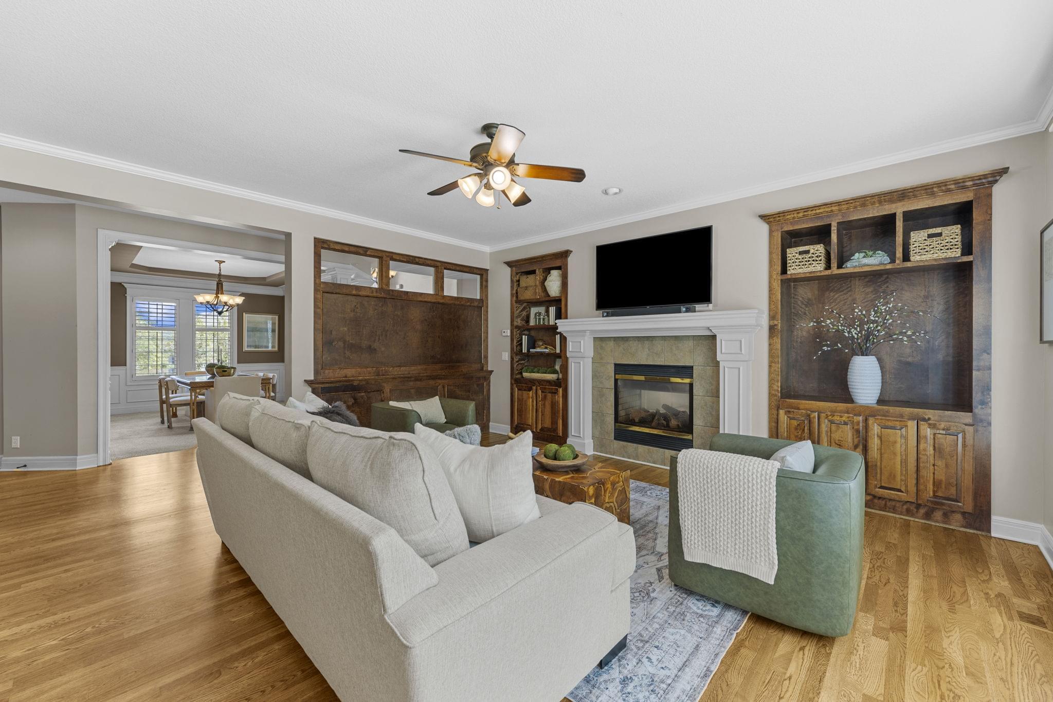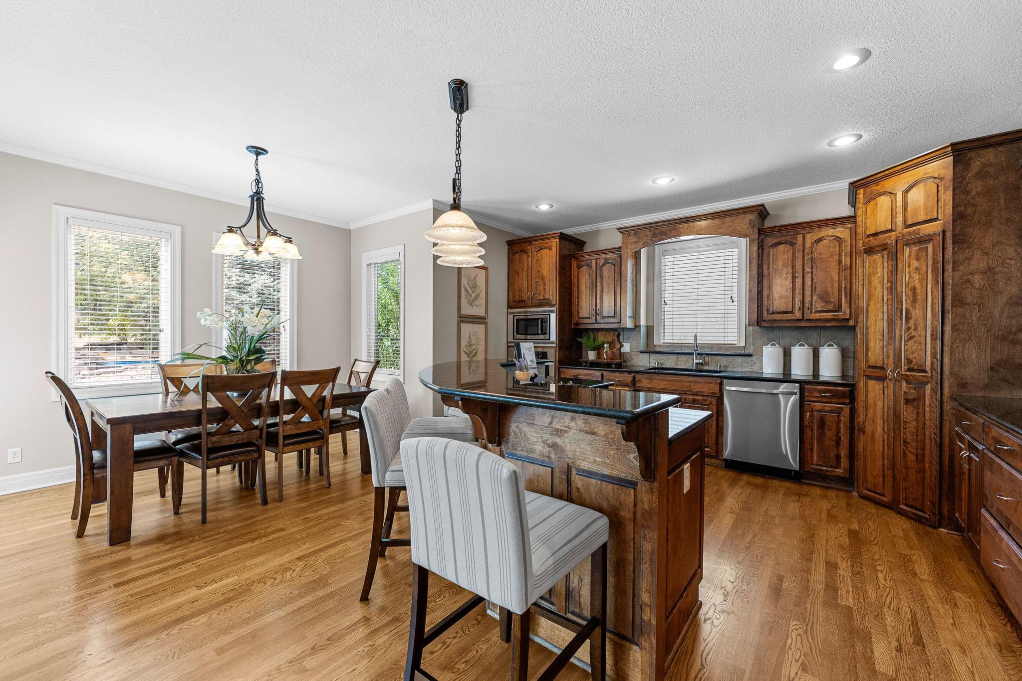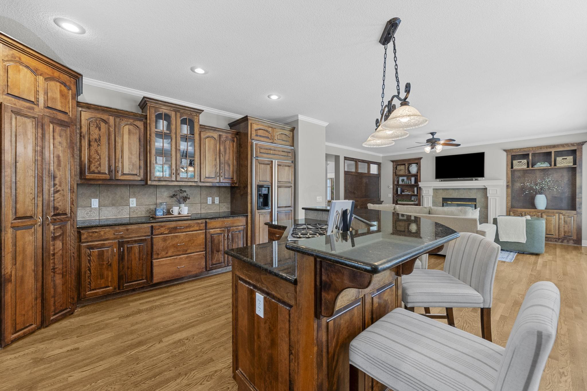 The main level was made for connection. Wood floors add warmth and character, guiding you from the dining room to the great room, where a fireplace and built-ins set the tone for relaxed living. Nearby, the kitchen blends style and function with stainless appliances, granite counters, and a walk-in pantry.