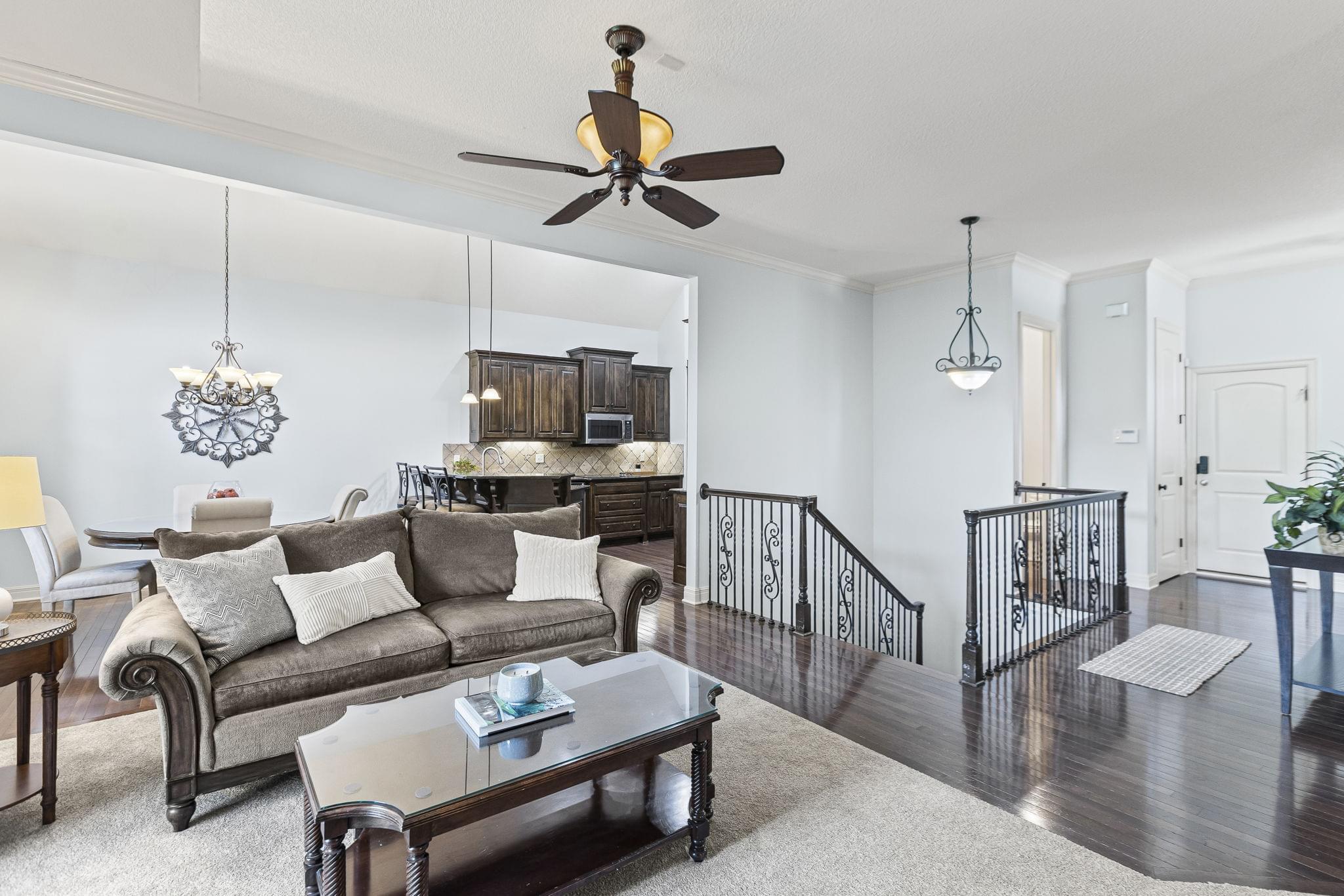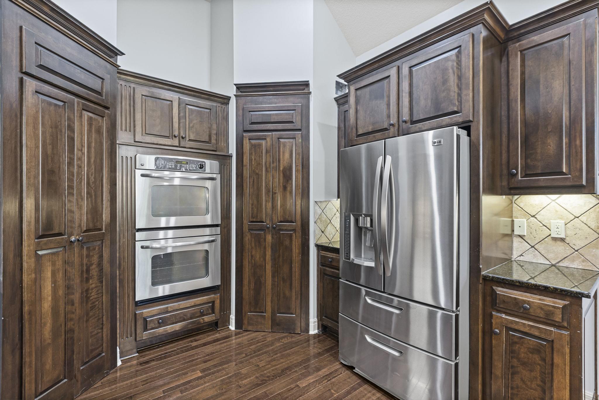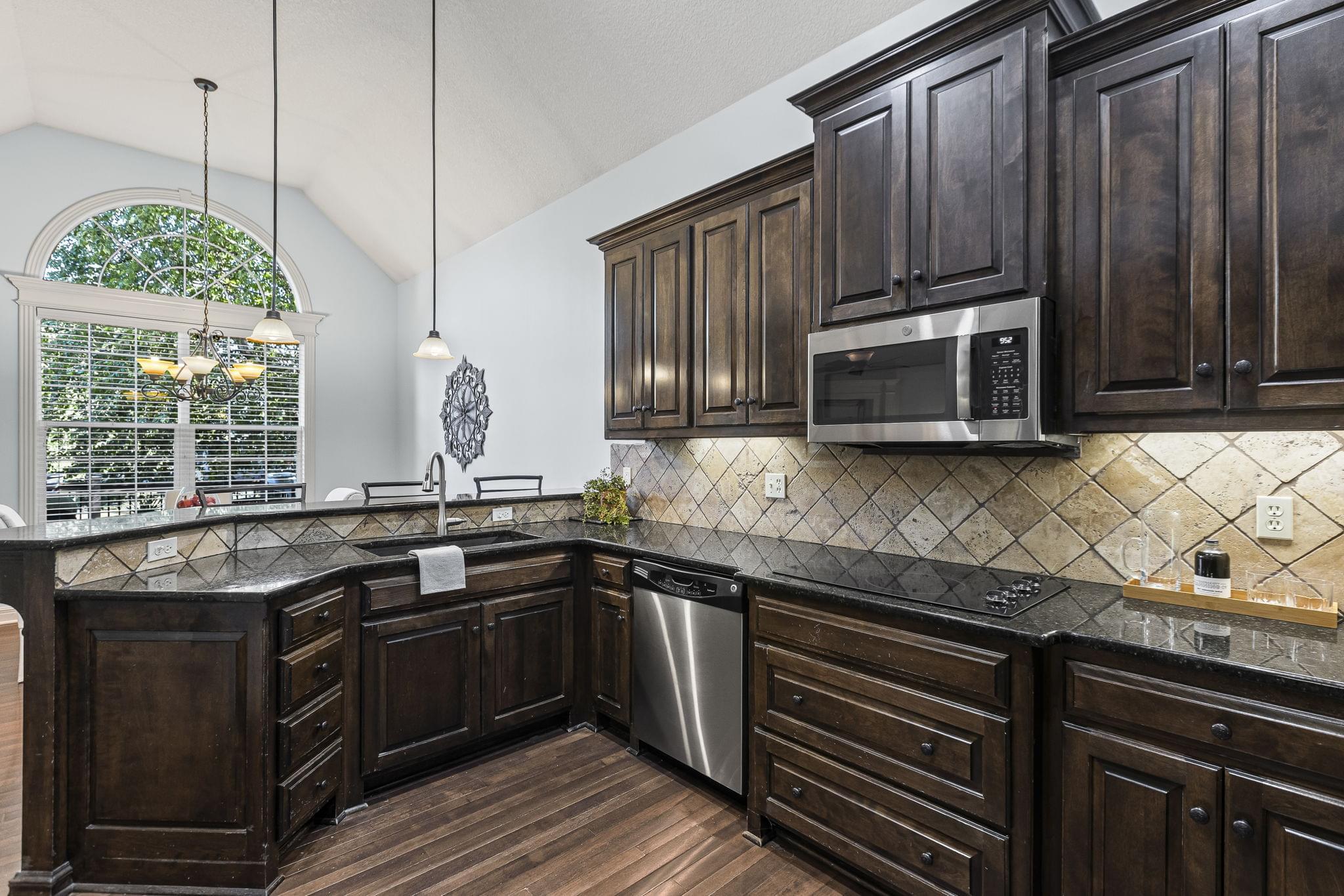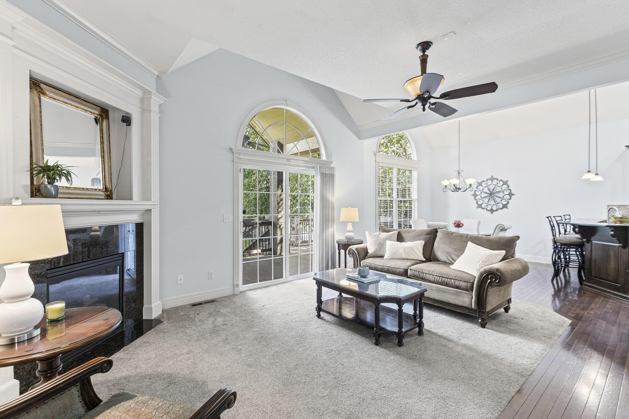 Lofty ceilings—10 to 12 feet on the main floor—create a bright, airy feel throughout the great room, anchored by a fireplace and flanked by arched windows that bring the outdoors in. The kitchen combines function and form, with granite counters, stainless appliances, double ovens, and double pantries—everything you need, right where you want it.