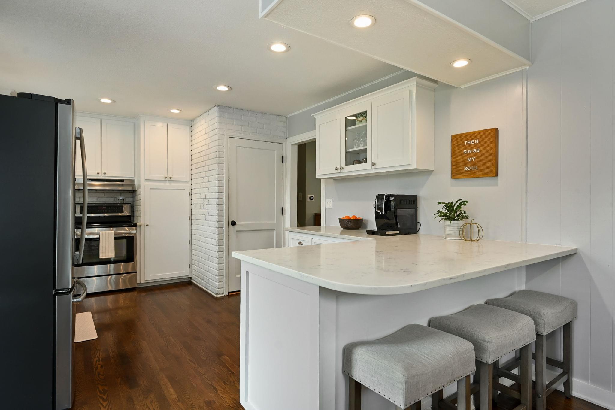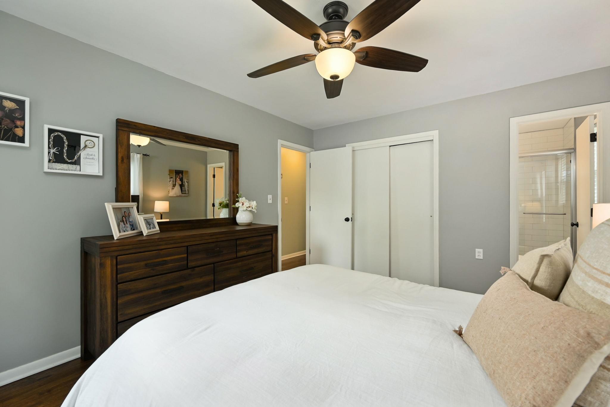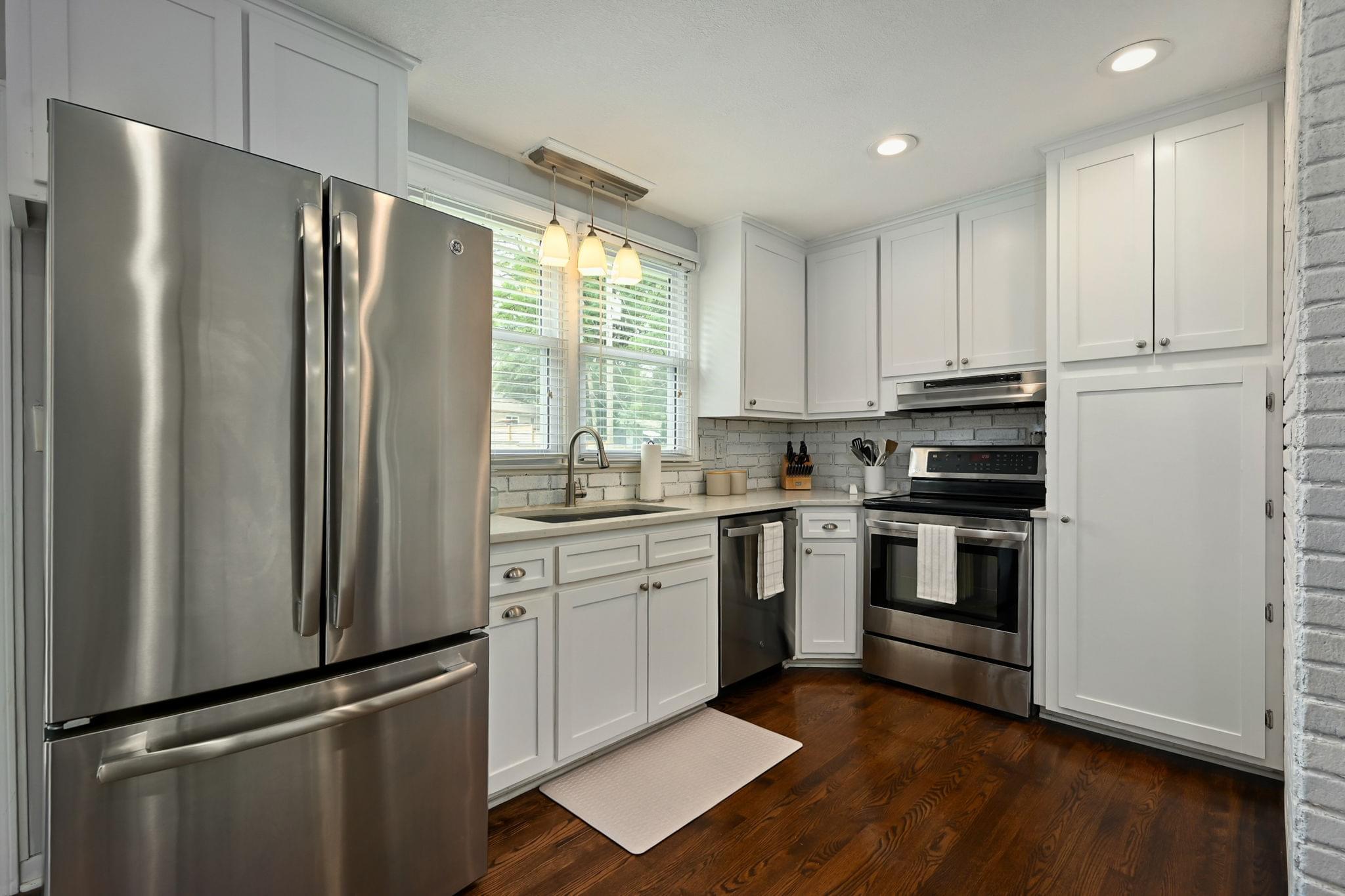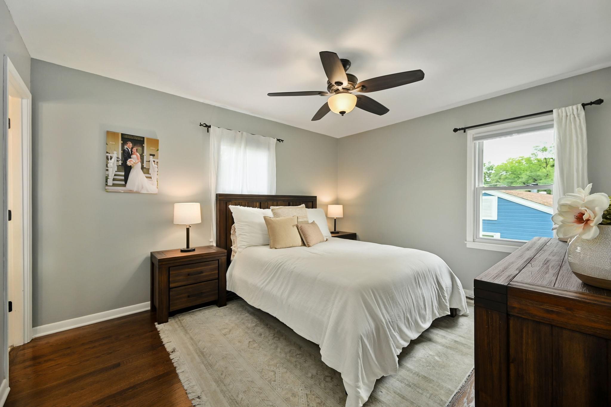 Inside, hardwood floors bring warmth underfoot, ceiling fans keep the upstairs breezy, and two renovated bathrooms cut down on projects. The kitchen brings a polished look with quartz counters, stainless appliances, and shaker cabinetry—updated finishes that feel both timeless and functional.