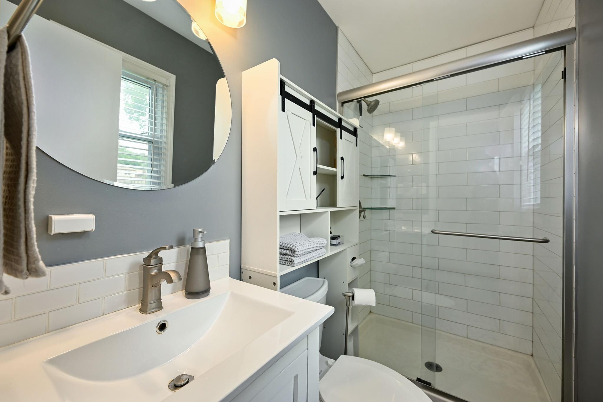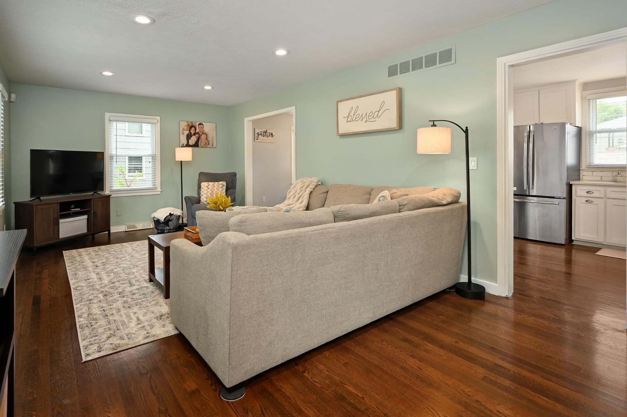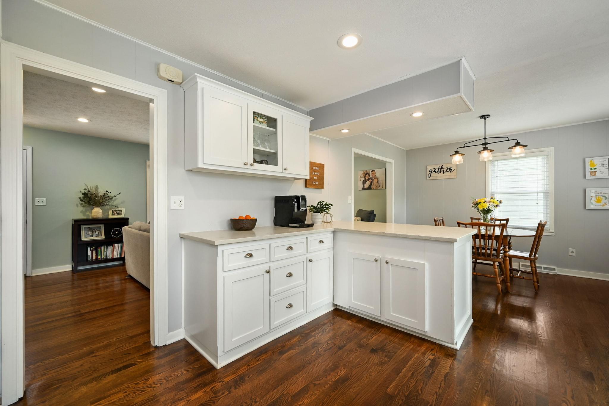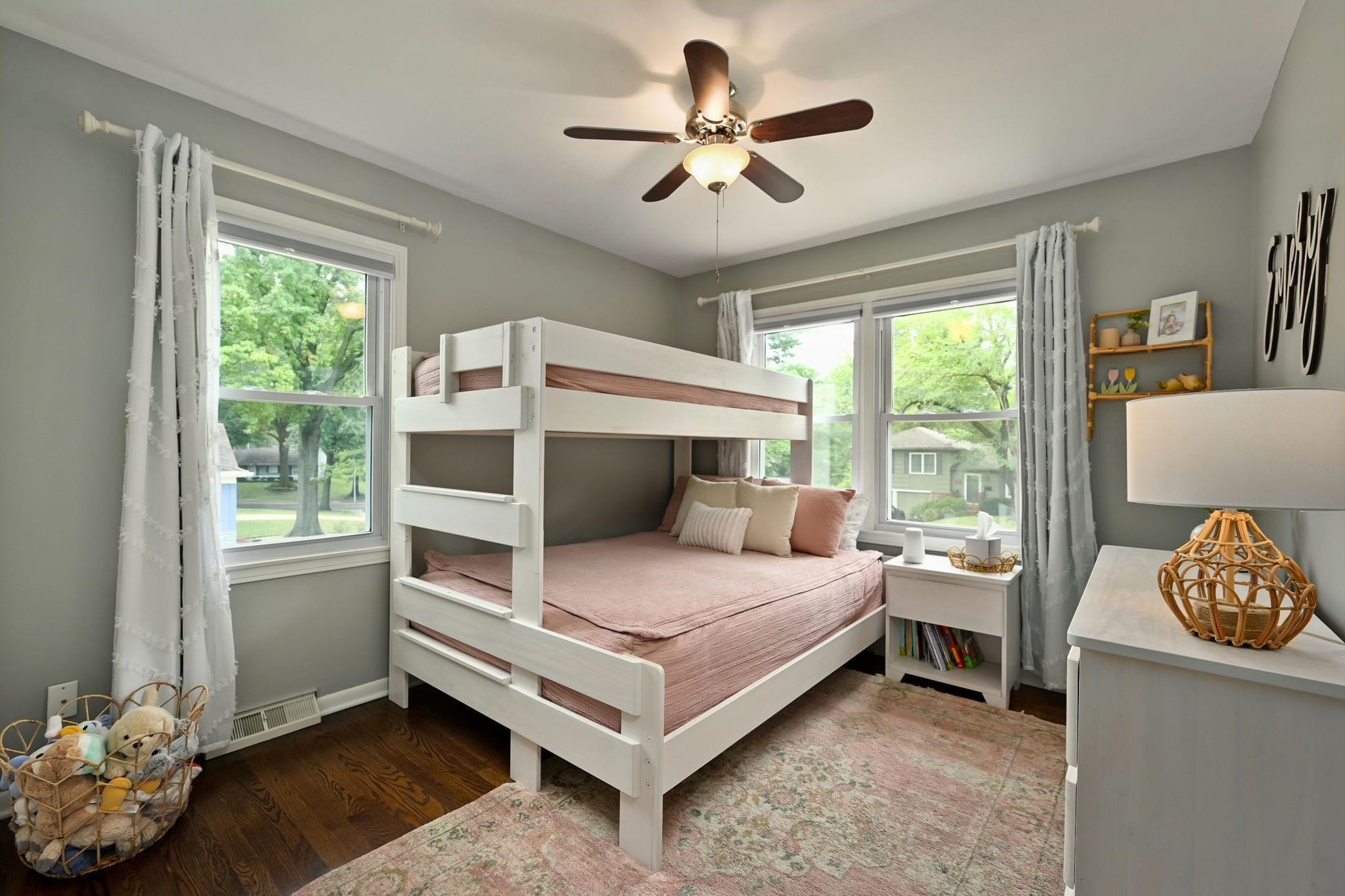 Inside, hardwood floors bring warmth underfoot, ceiling fans keep the upstairs breezy, and two renovated bathrooms cut down on projects. The kitchen brings a polished look with quartz counters, stainless appliances, and shaker cabinetry—updated finishes that feel both timeless and functional.