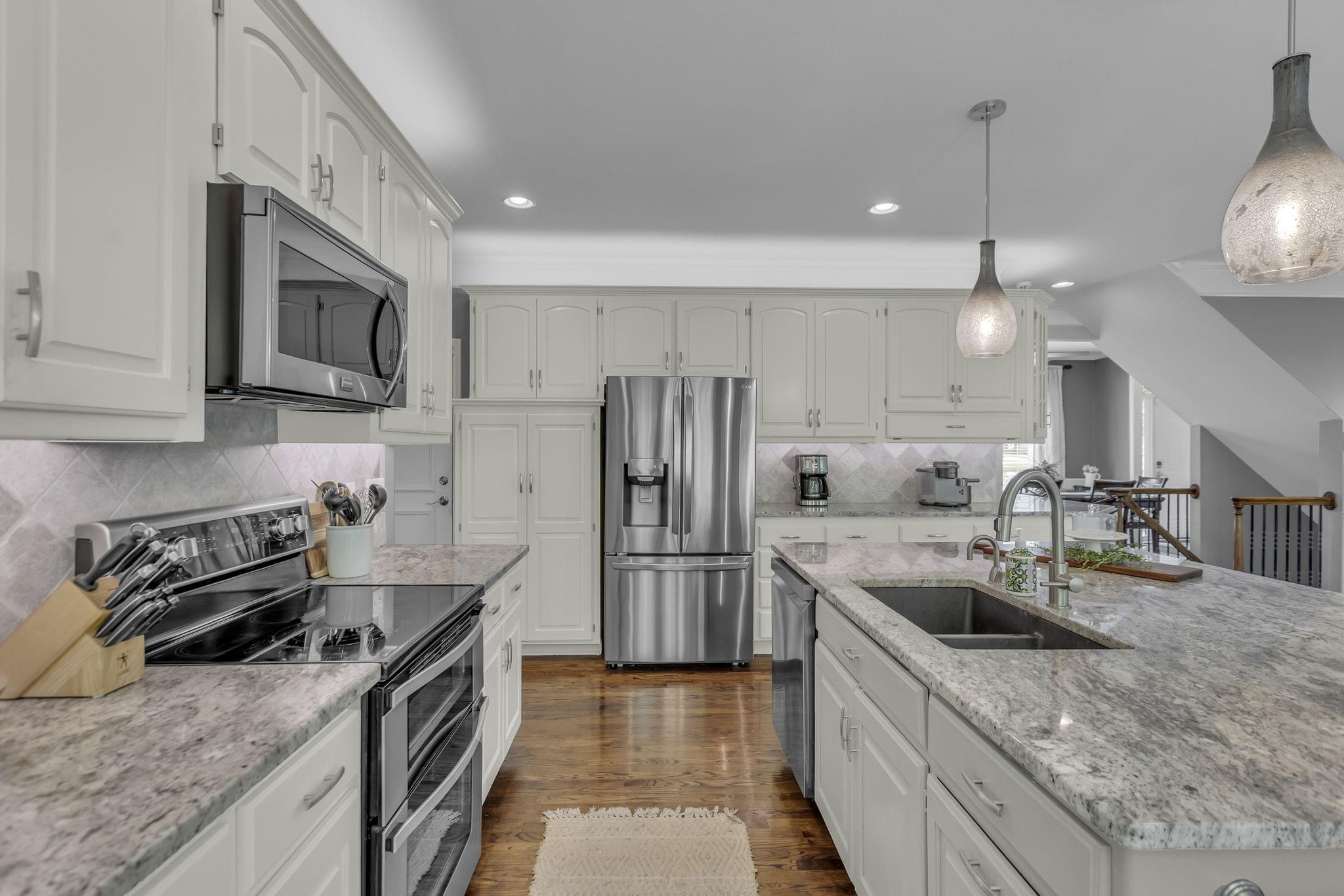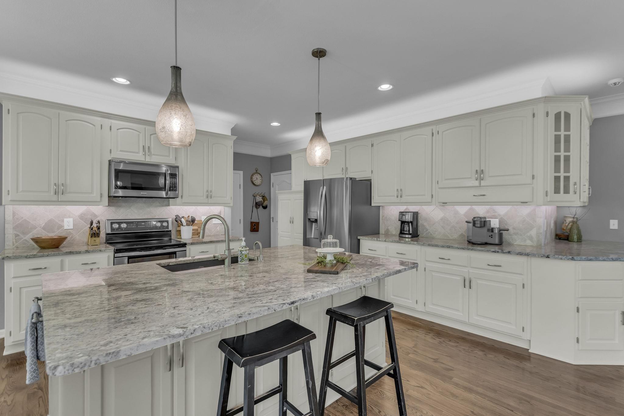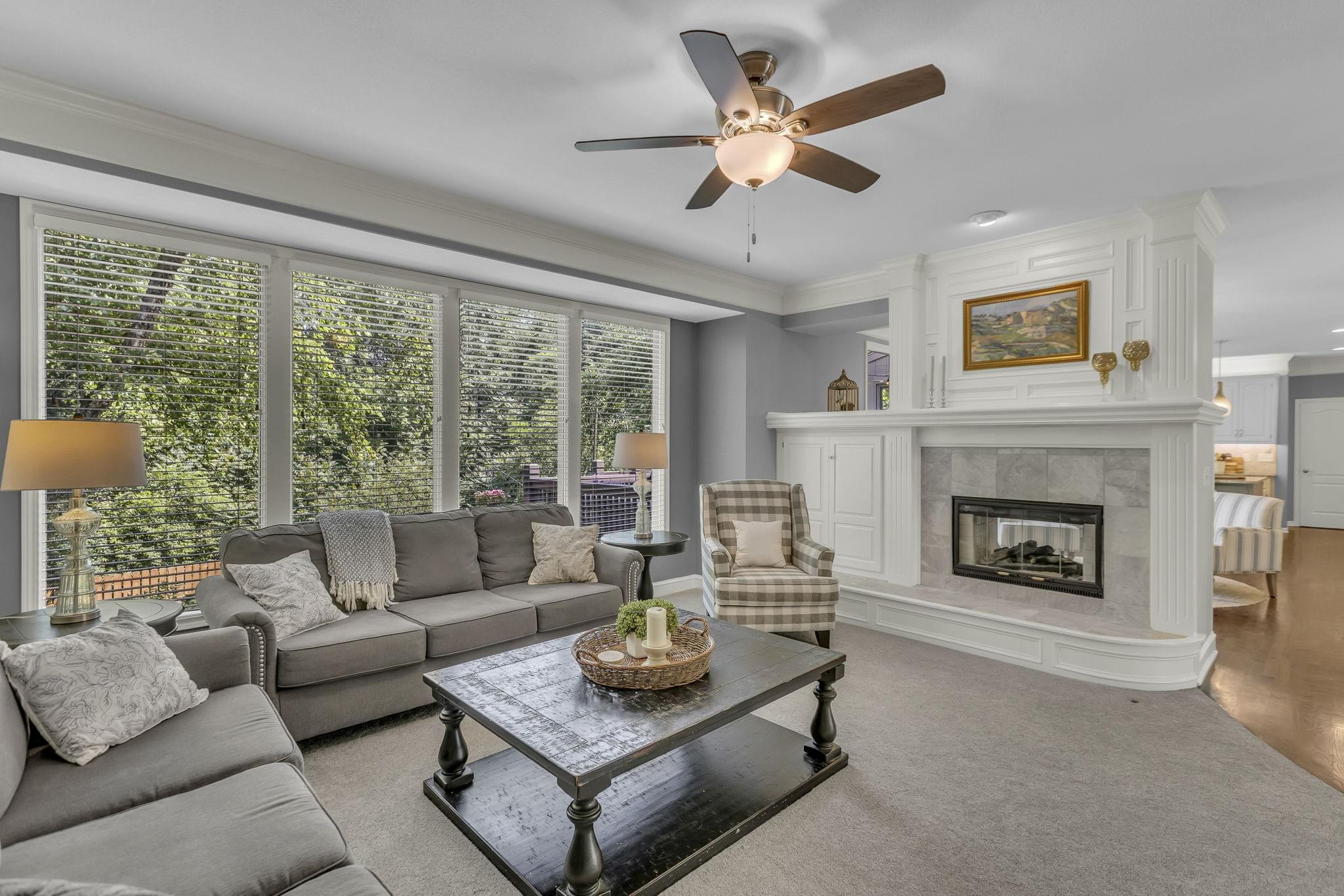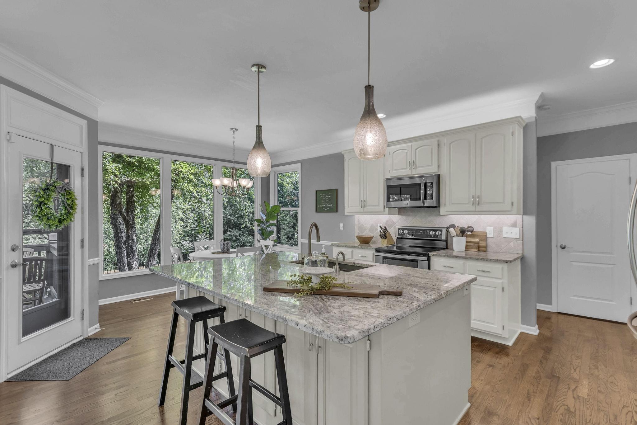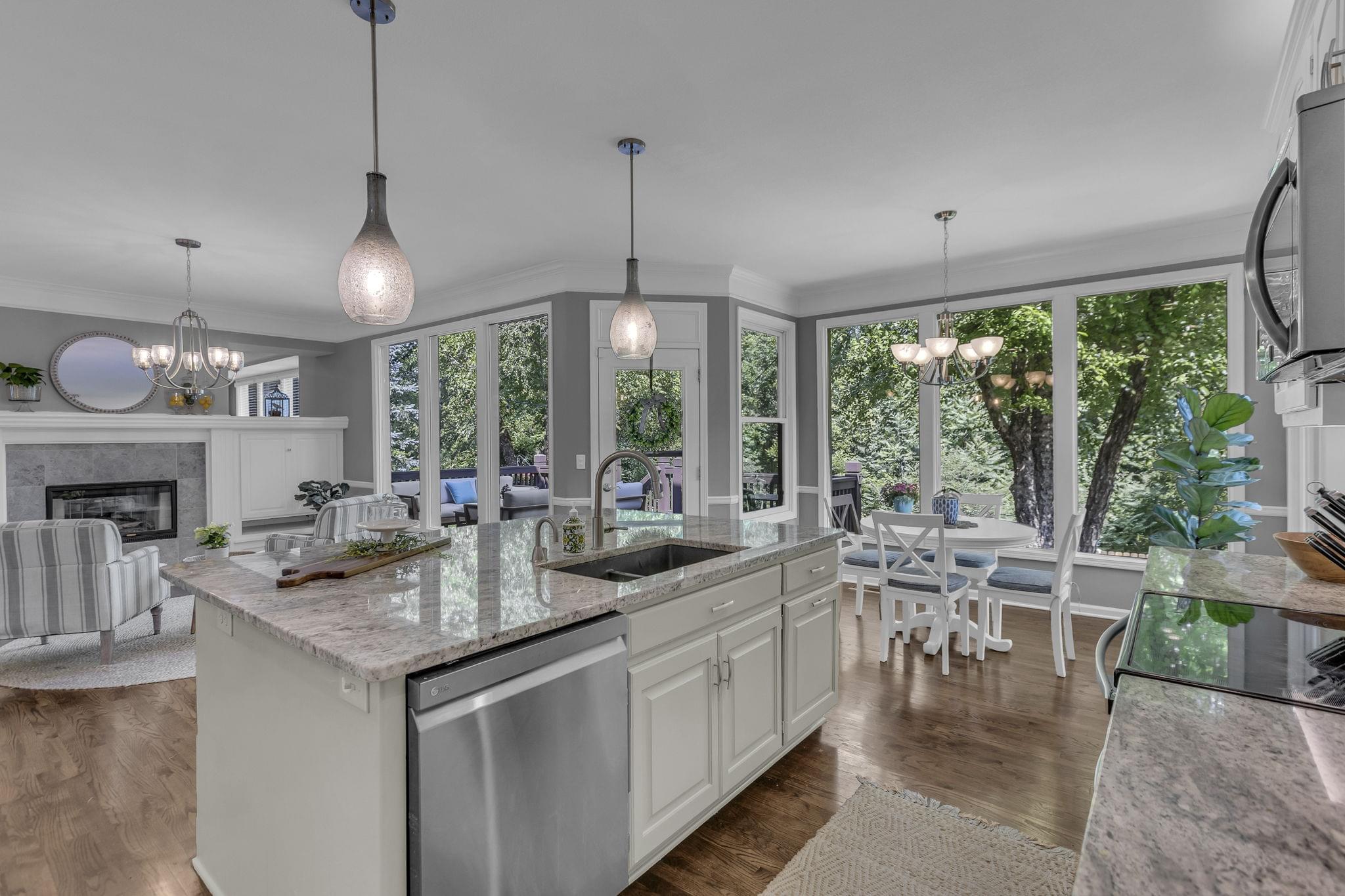 Inside, hardwood floors span the open-concept main level. A see-through fireplace connects the great room and hearth room, while walls of windows in both rooms draw in natural light and frame the greenery beyond. The kitchen offers lovely granite counters, stainless appliances, an oversized island, and striking pendant lighting. A home office, formal dining, laundry, and half bath round out the main floor.