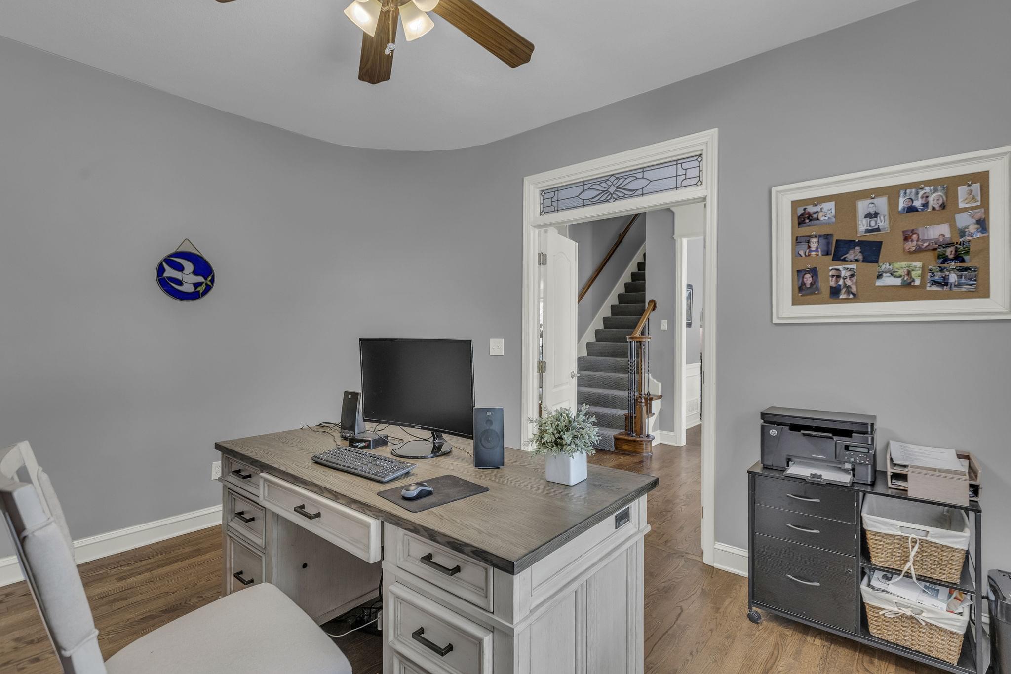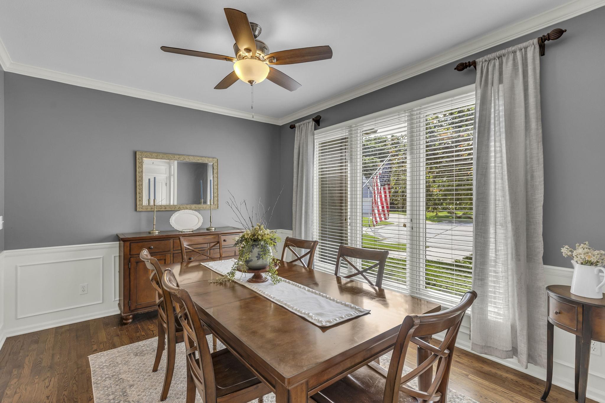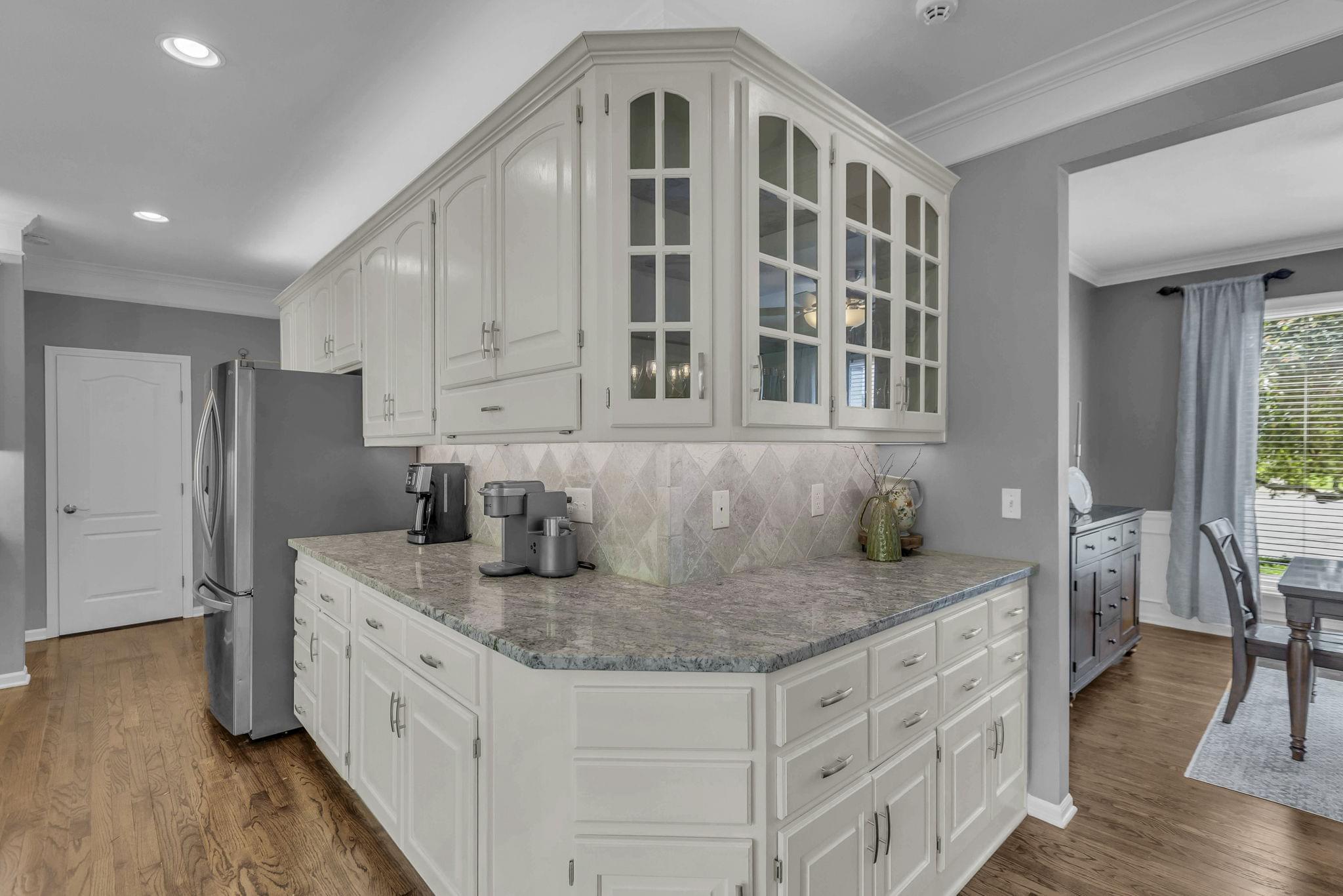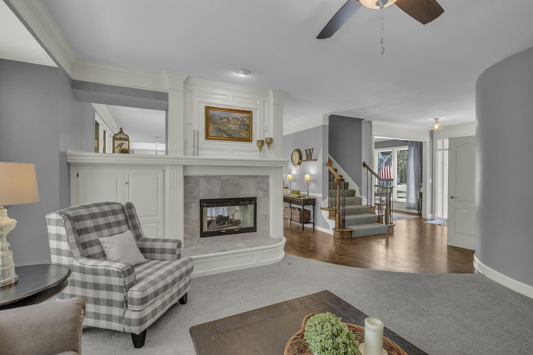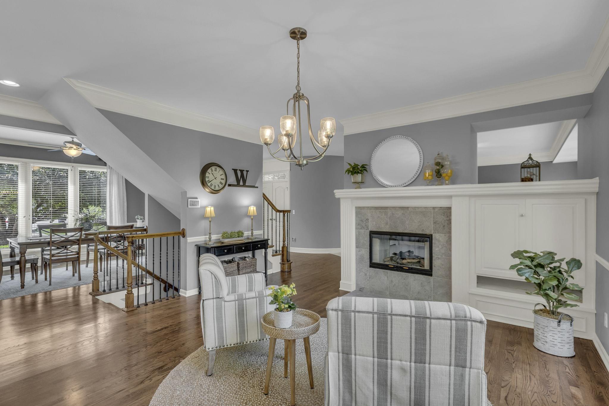 Inside, hardwood floors span the open-concept main level. A see-through fireplace connects the great room and hearth room, while walls of windows in both rooms draw in natural light and frame the greenery beyond. The kitchen offers lovely granite counters, stainless appliances, an oversized island, and striking pendant lighting. A home office, formal dining, laundry, and half bath round out the main floor.