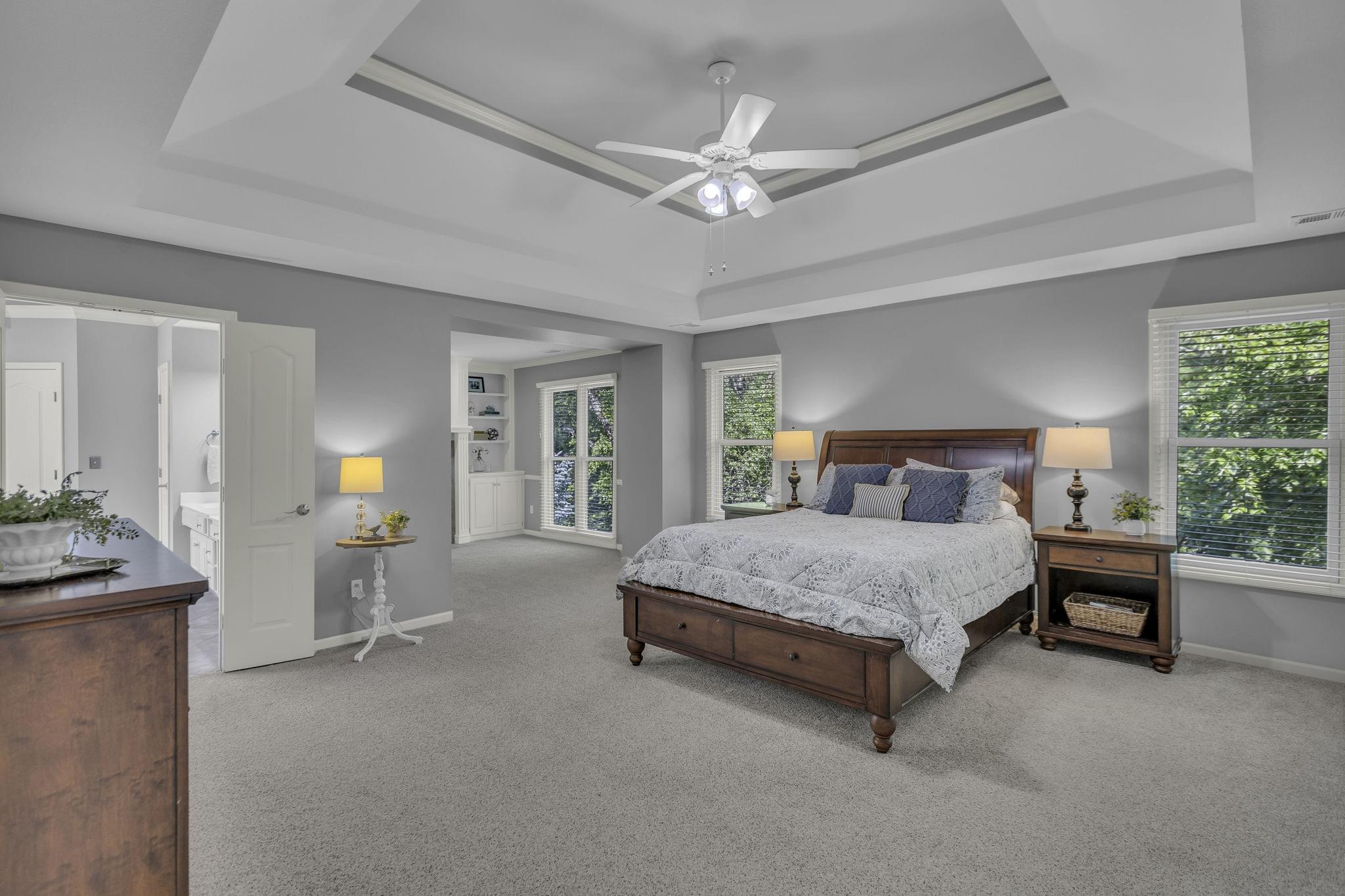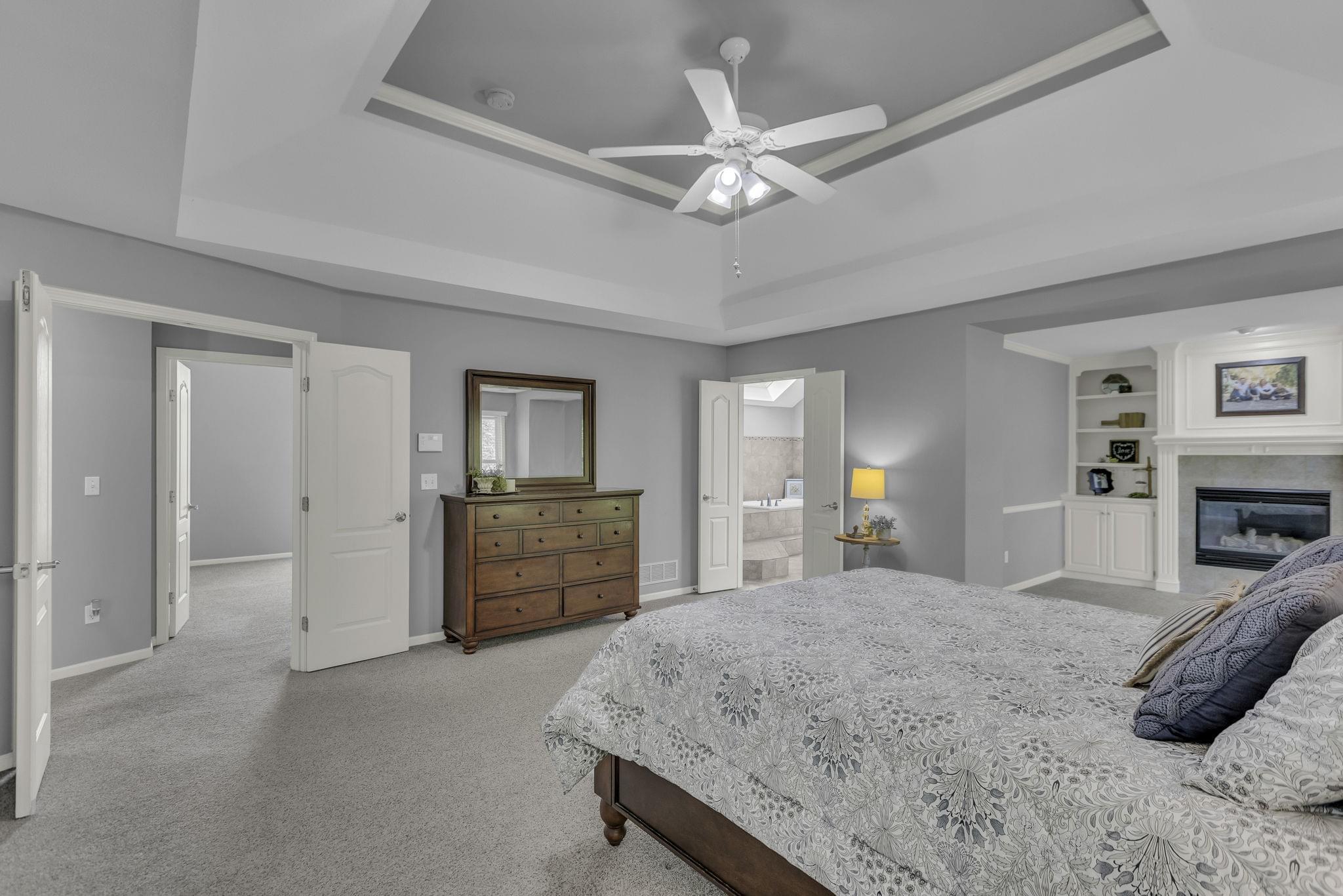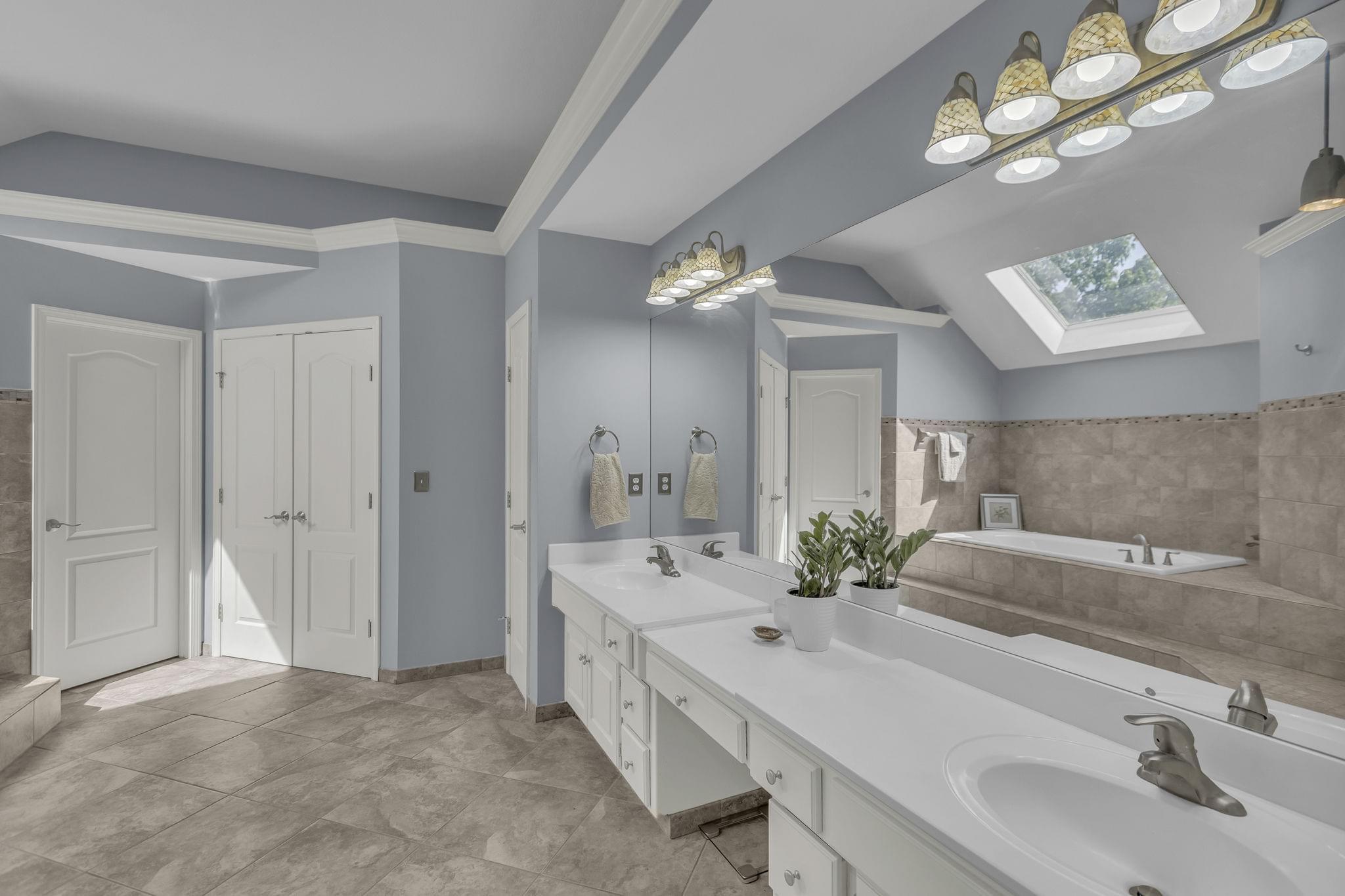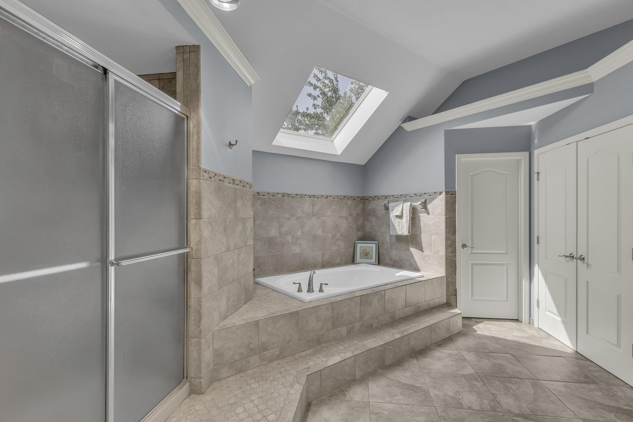 Upstairs, the spacious primary suite includes a sitting area with fireplace, walk-in closet, and a spa-style bath with heated tile floors, dual vanities, jetted tub, skylight, and separate shower with overhead heat lamps. Three additional bedrooms all include walk-in closets and ceiling fans. One has a private bath, while two share a Jack-and-Jill with separate vanities.