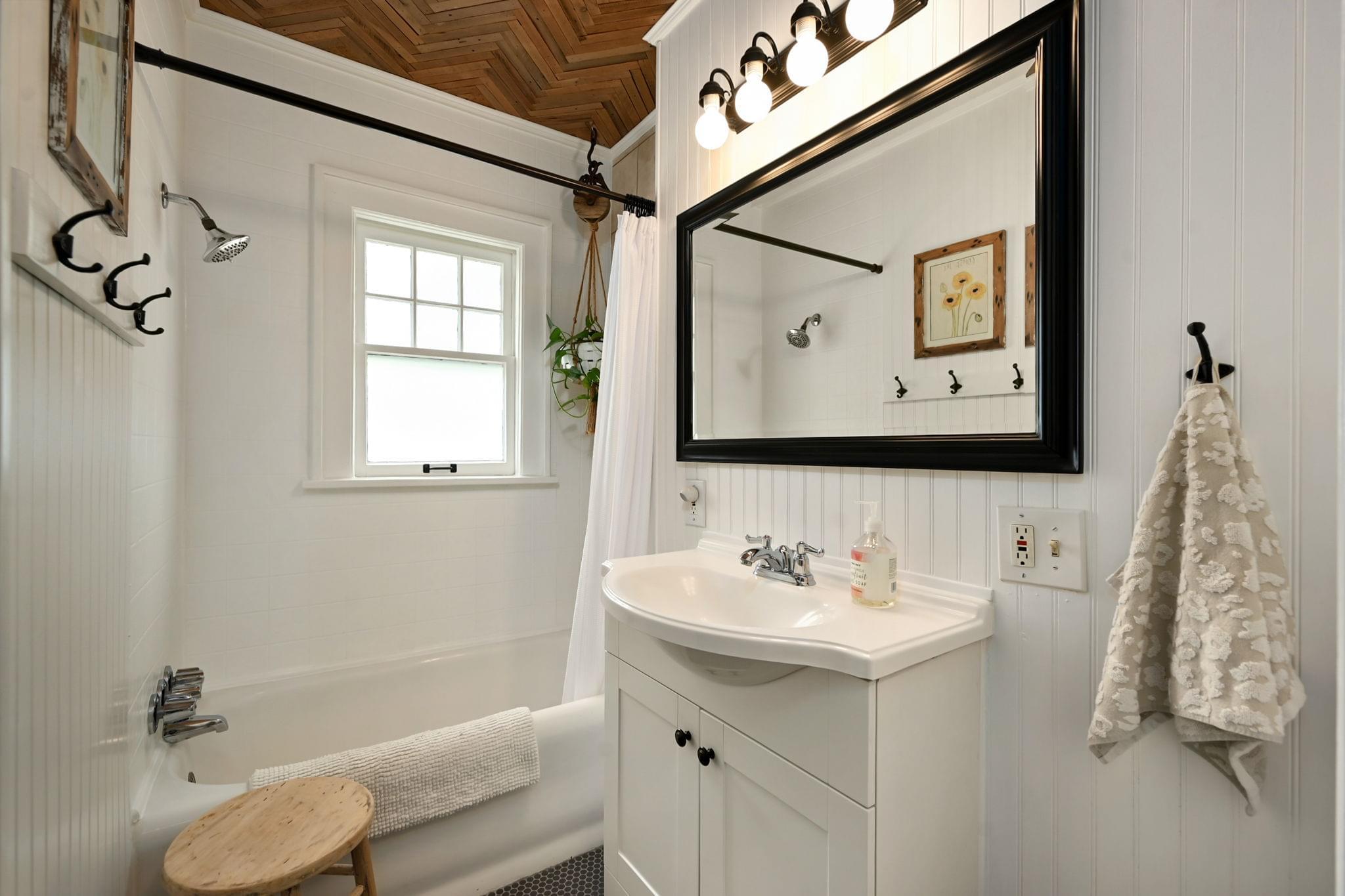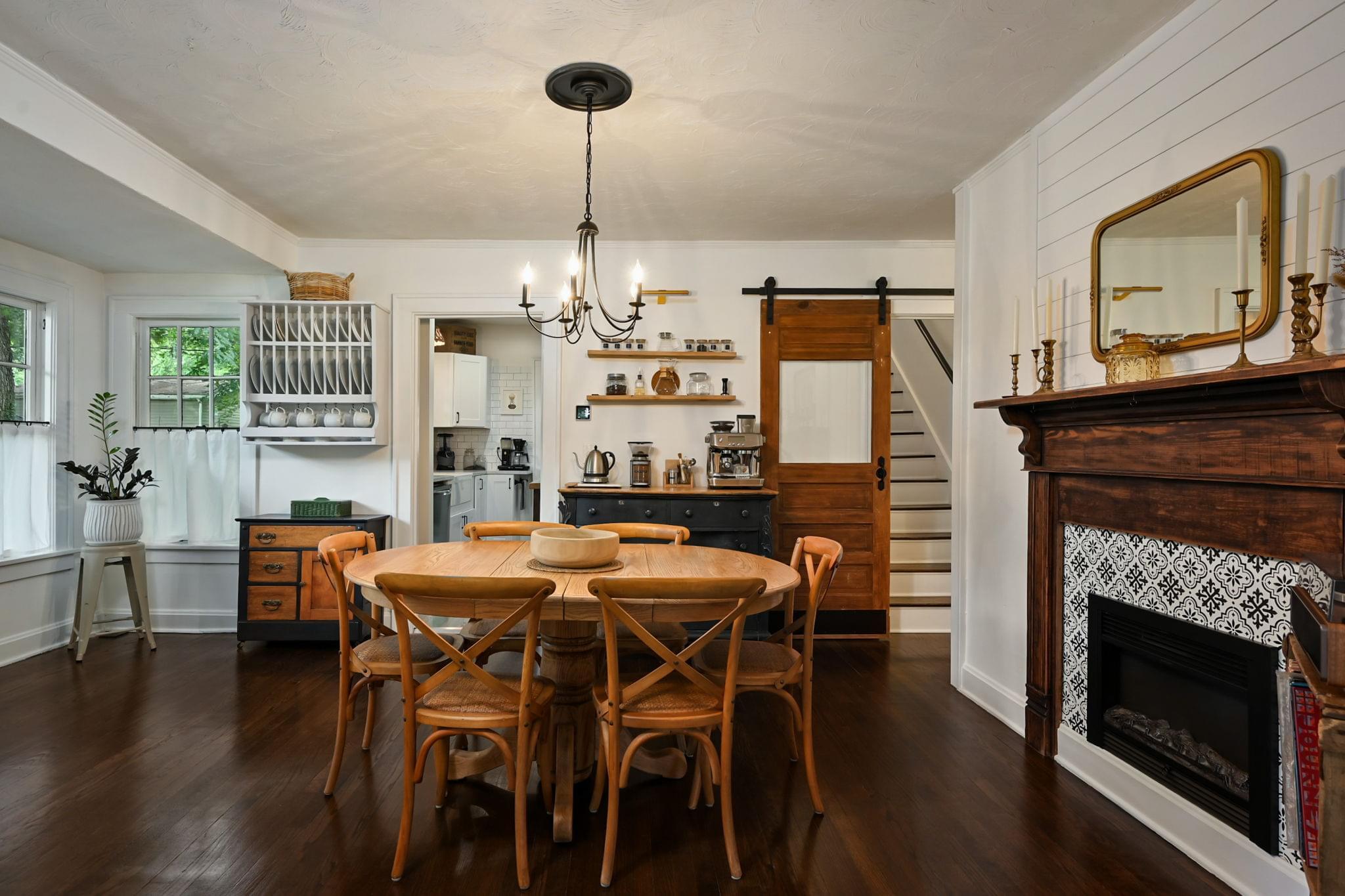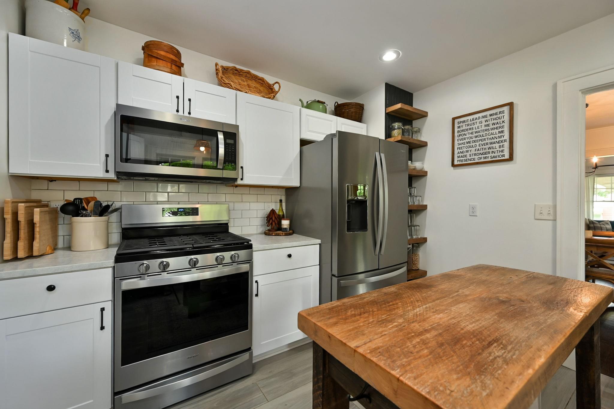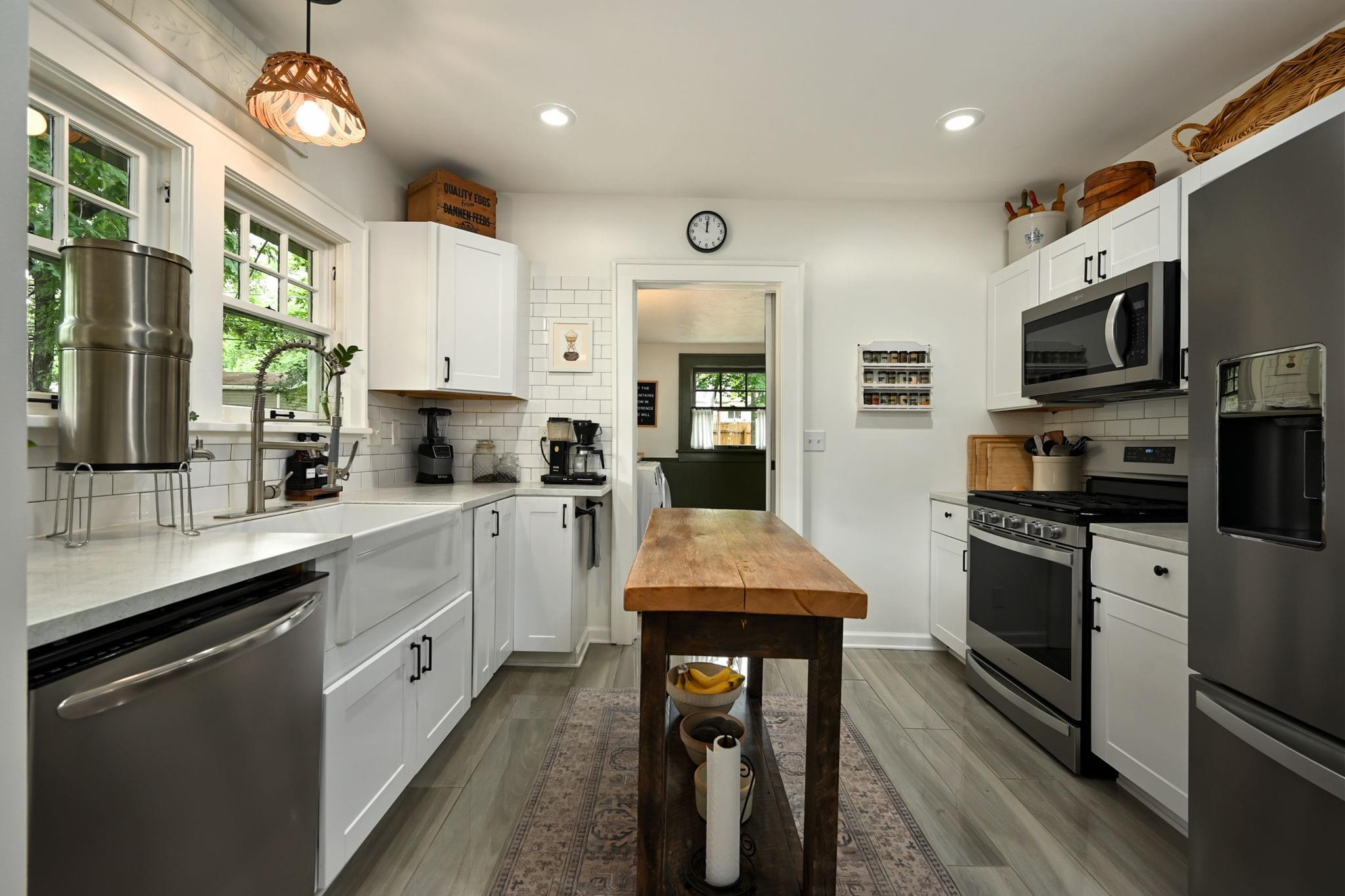 Inside, the home opens to light-filled spaces with an effortless flow. The kitchen is a total scene-stealer: crisp white cabinetry, butcher block island, subway tile, stainless steel appliances, and a farmhouse sink that ties it all together. The adjacent dining room is ready for everyday meals or relaxed gatherings.