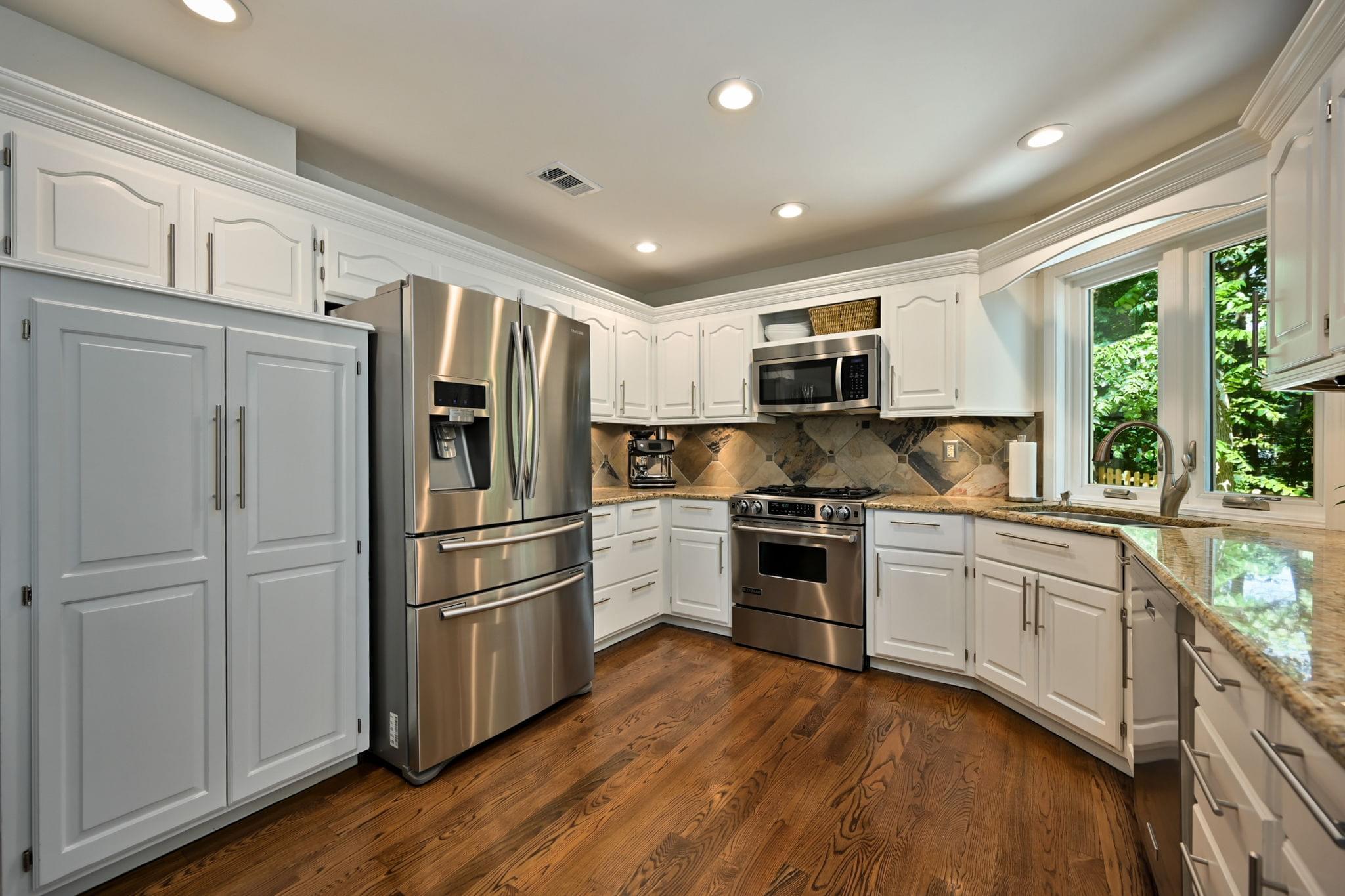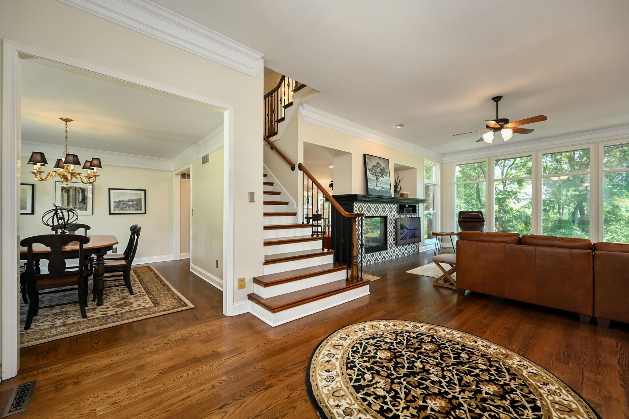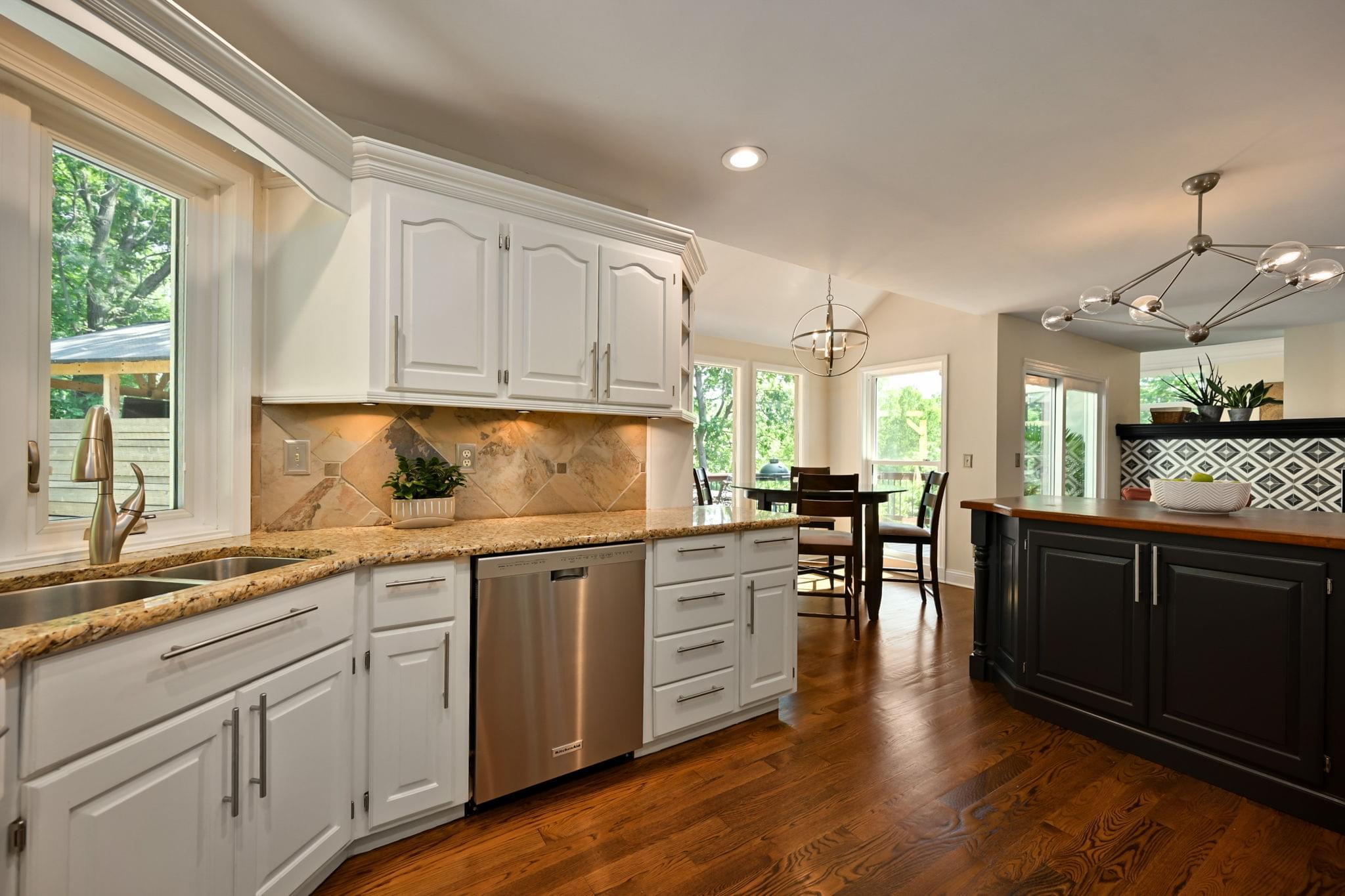 This inviting kitchen and hearth room combo boasts an island with seating, breakfast nook, stainless appliances, and the same gorgeous graphic tile on the fireplace surround. Large windows connect you to the beautiful outdoor deck and lush backyard, cementing its role as the heart of the home.
