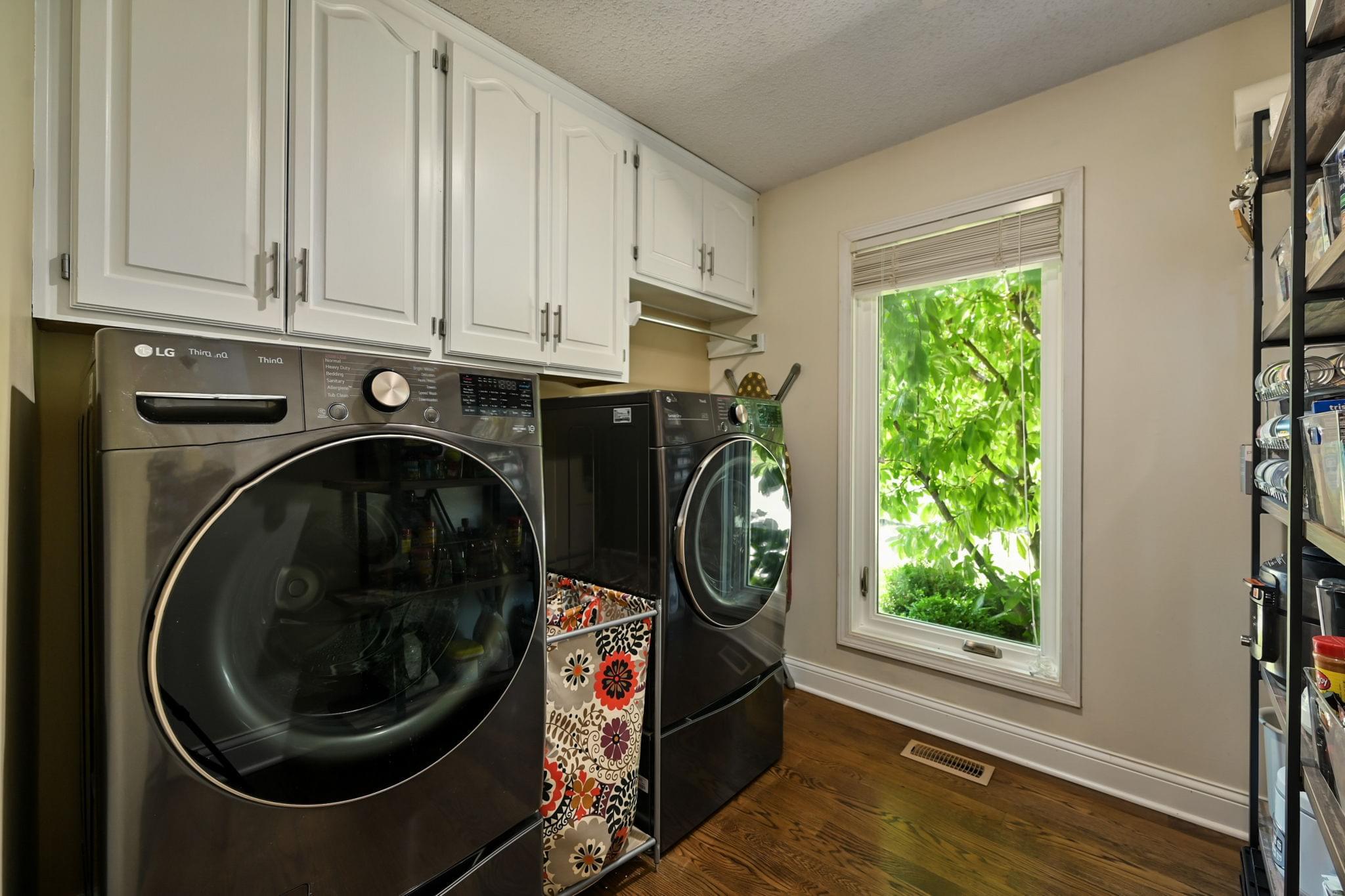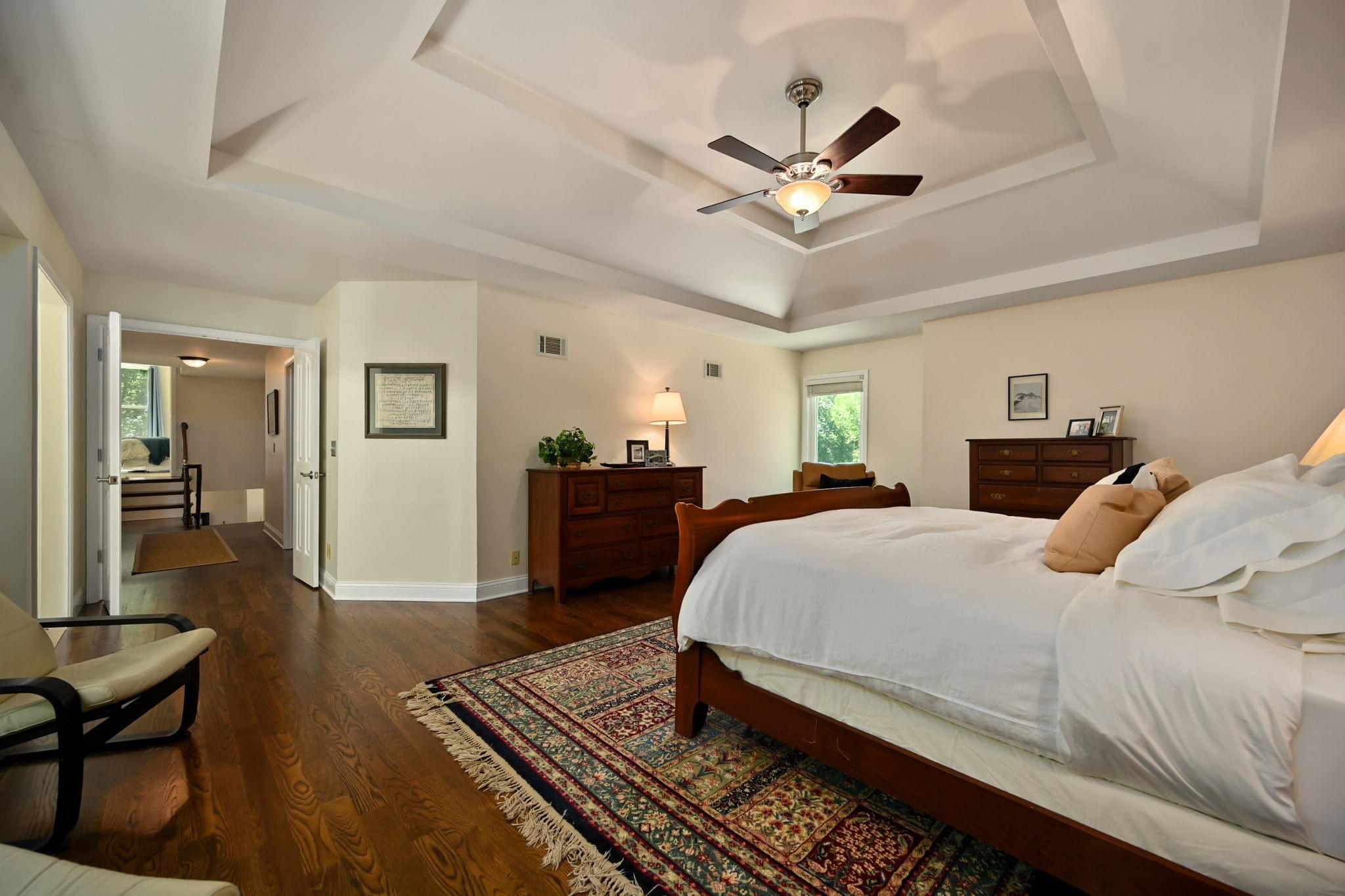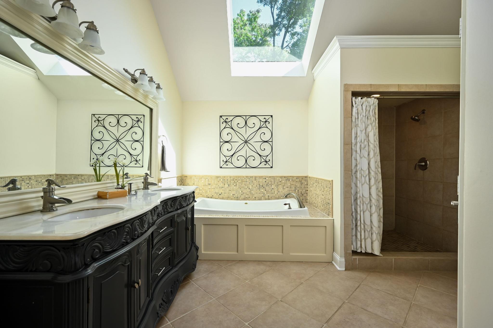 This inviting kitchen and hearth room combo boasts an island with seating, breakfast nook, stainless appliances, and the same gorgeous graphic tile on the fireplace surround. Large windows connect you to the beautiful outdoor deck and lush backyard, cementing its role as the heart of the home.