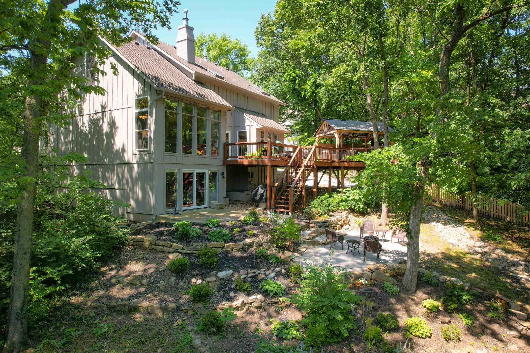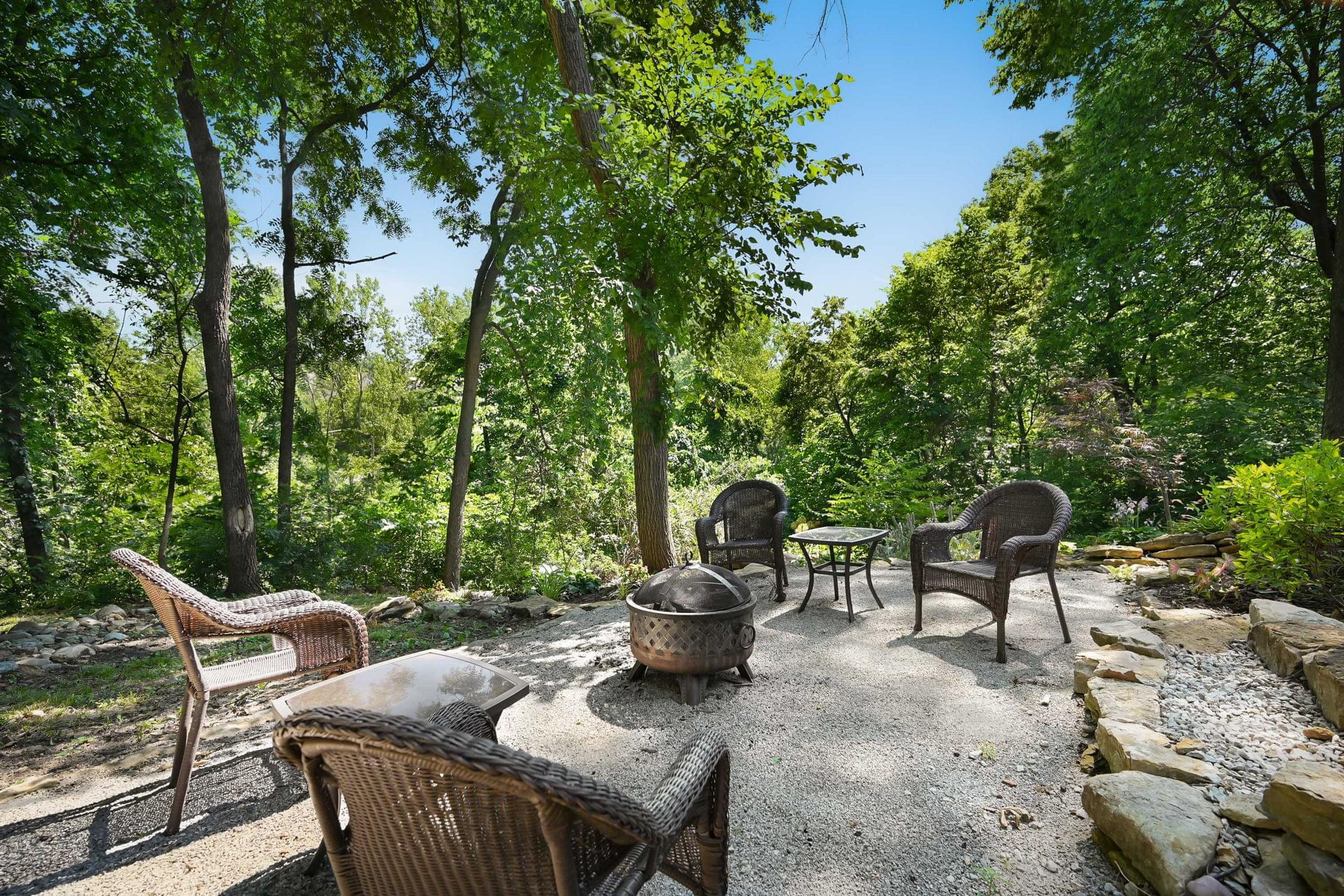 Relax on the expansive deck featuring a charming covered lounging area, a patio, and a fire pit as destination spots. This tranquil space, with its lush greenery and treed backdrop views, is ideal for unwinding and enjoying nature.