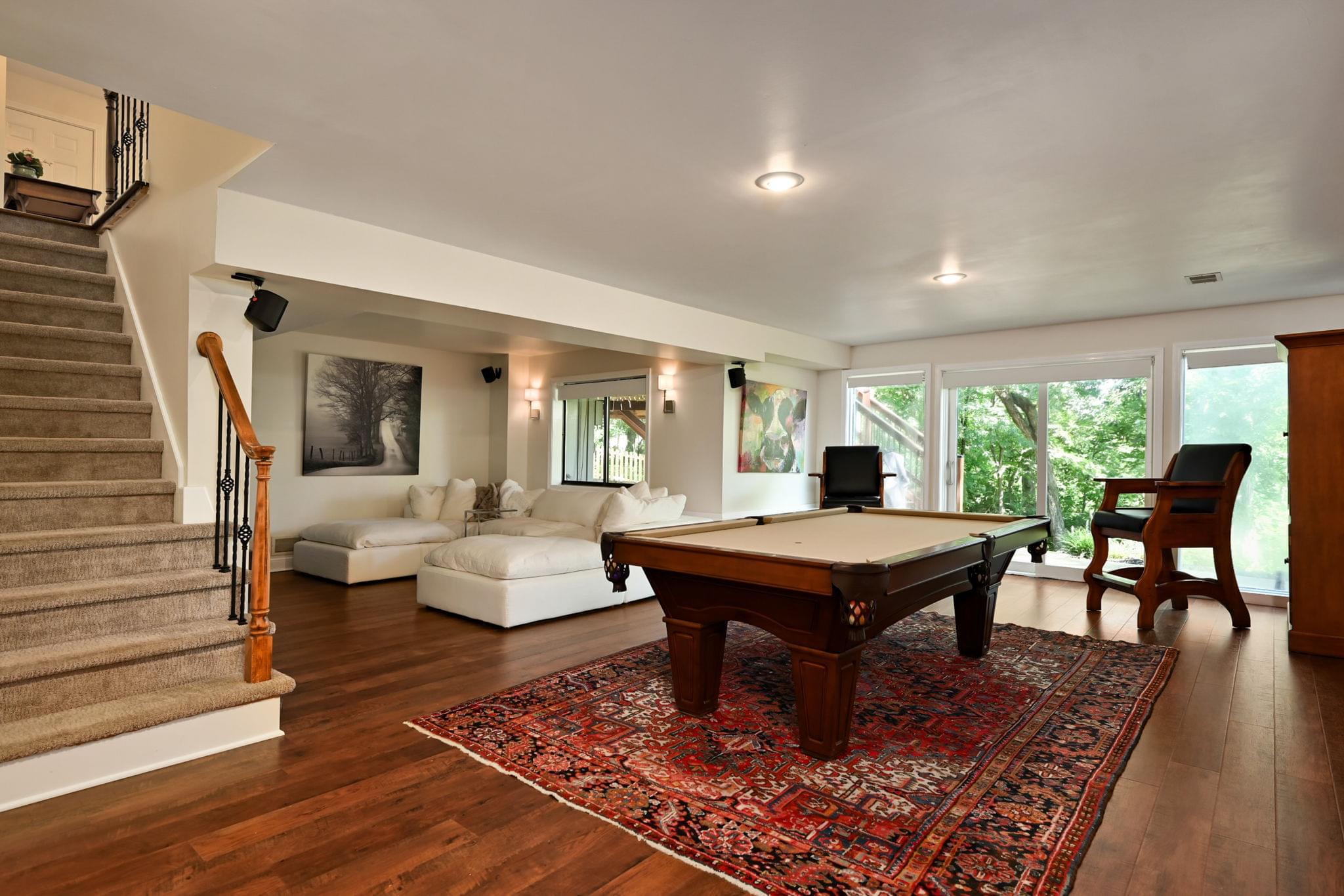 The finished walk-out basement offers a welcoming seating area for movie night and a pool table that stays. It's an ideal spot for family activities and entertaining friends.